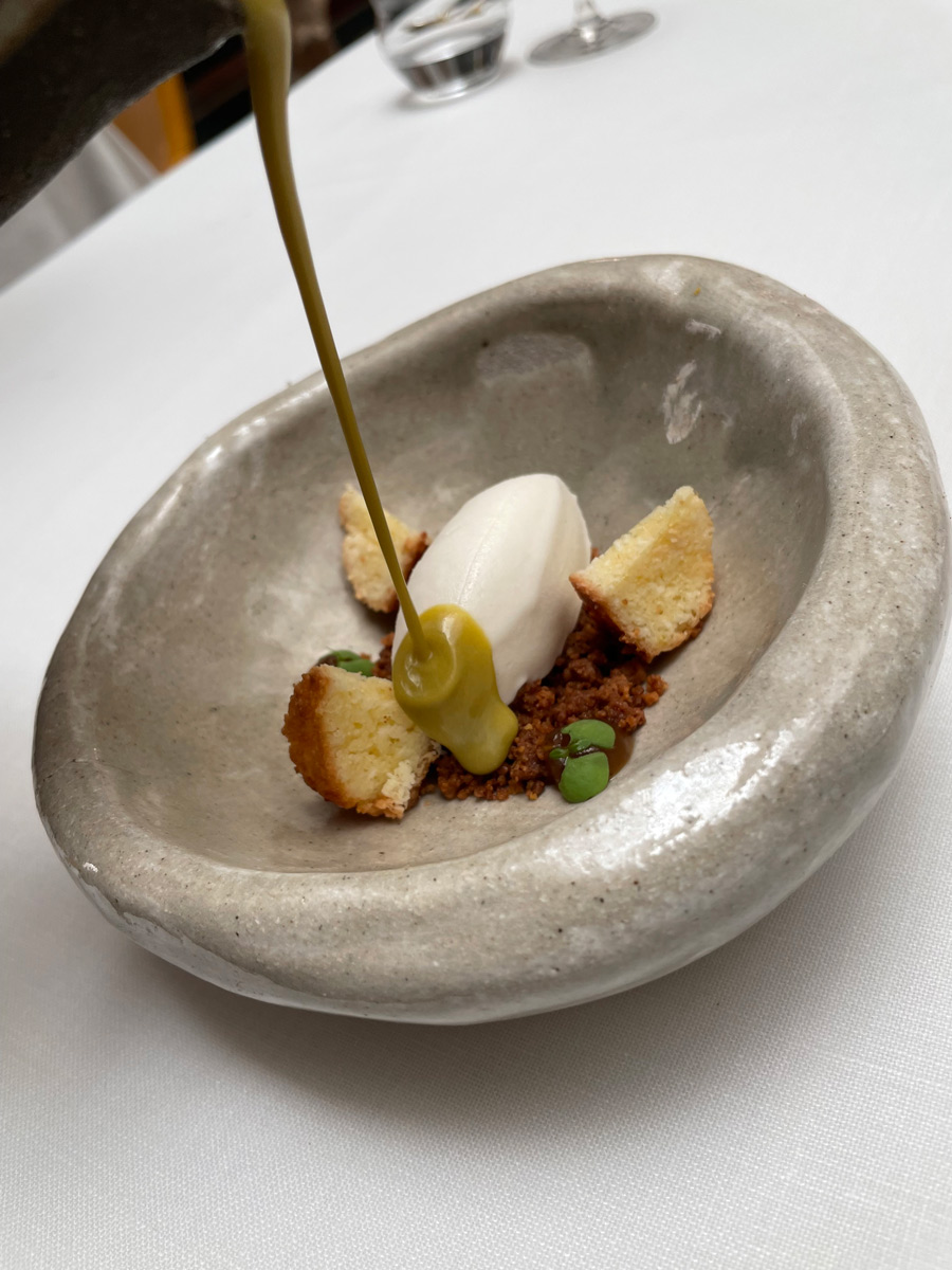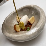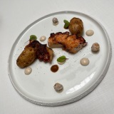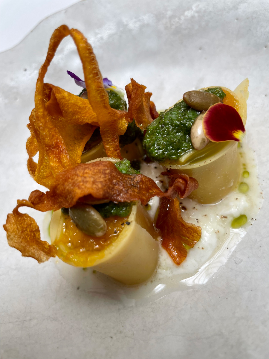 After two tasty snacks each, we began with celery stew with clams, carbonara sauce, and Iberian bacon, and an interpretation of Mallorcan ‘sopas’, with duck-stuffed pasta. Both dishes were excellent.