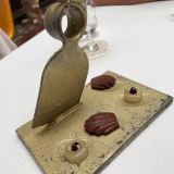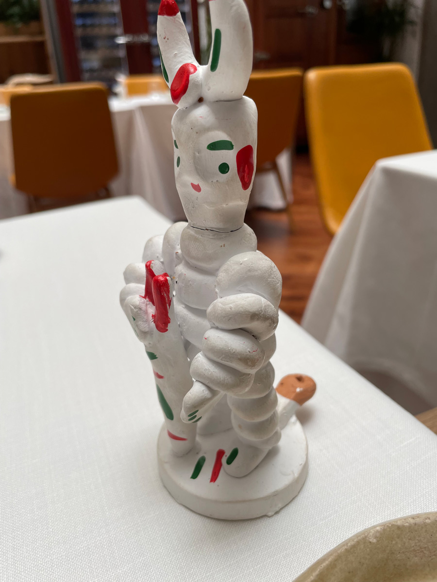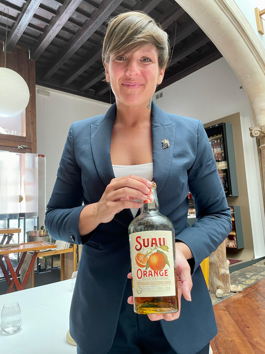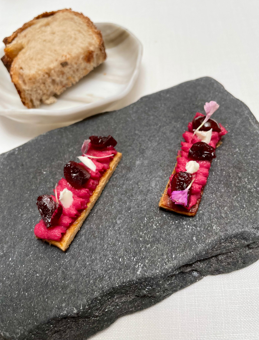The charming restaurant manager and sommelier Giorgia Scaramella greeted us and showed us to our table. We began with a glass of Vermú-Da, Andreu Genestra’s own vermouth (he also offers his wines here), while studying the lunch menu. This menu – which changes every 15 days – comprises snacks, and the choice of two starters, two mains, two desserts, and petit fours. All for 38€. Bread service is worth the 4€ charge, as the excellent breads are made by the association Esment’s bakery and served with Aubocassa extra virgin olive oil from the Manacor countryside and Aromata’s herbed butter.