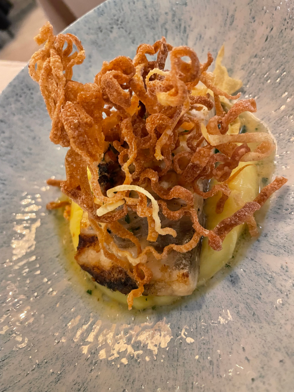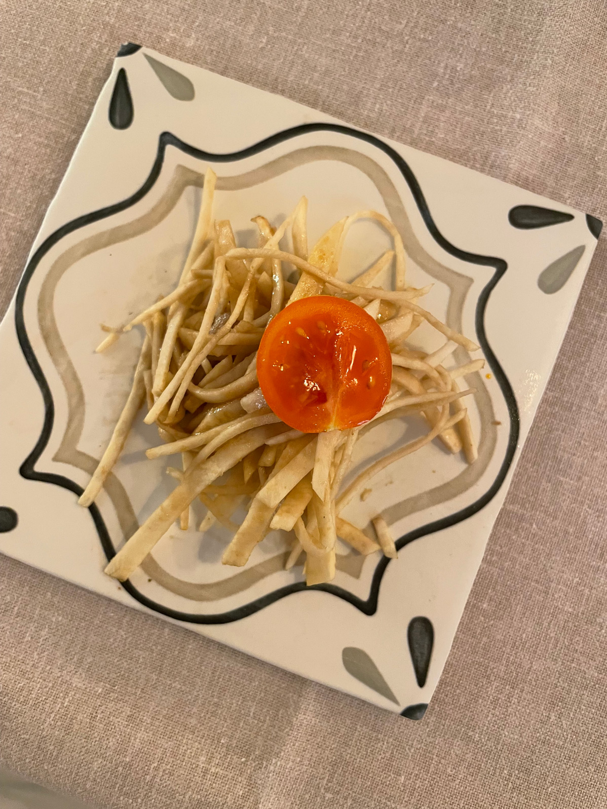 A complimentary appetizer of celeriac salad and a basket of good bread began our dinner. The extra virgin olive oil on the table came from the Son Poca Palla finca (also owned by Yartan Hotels)