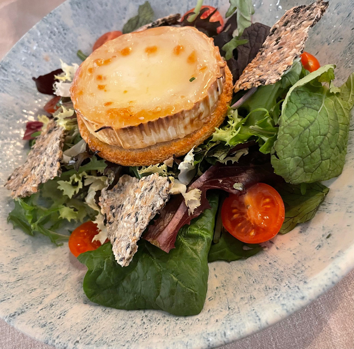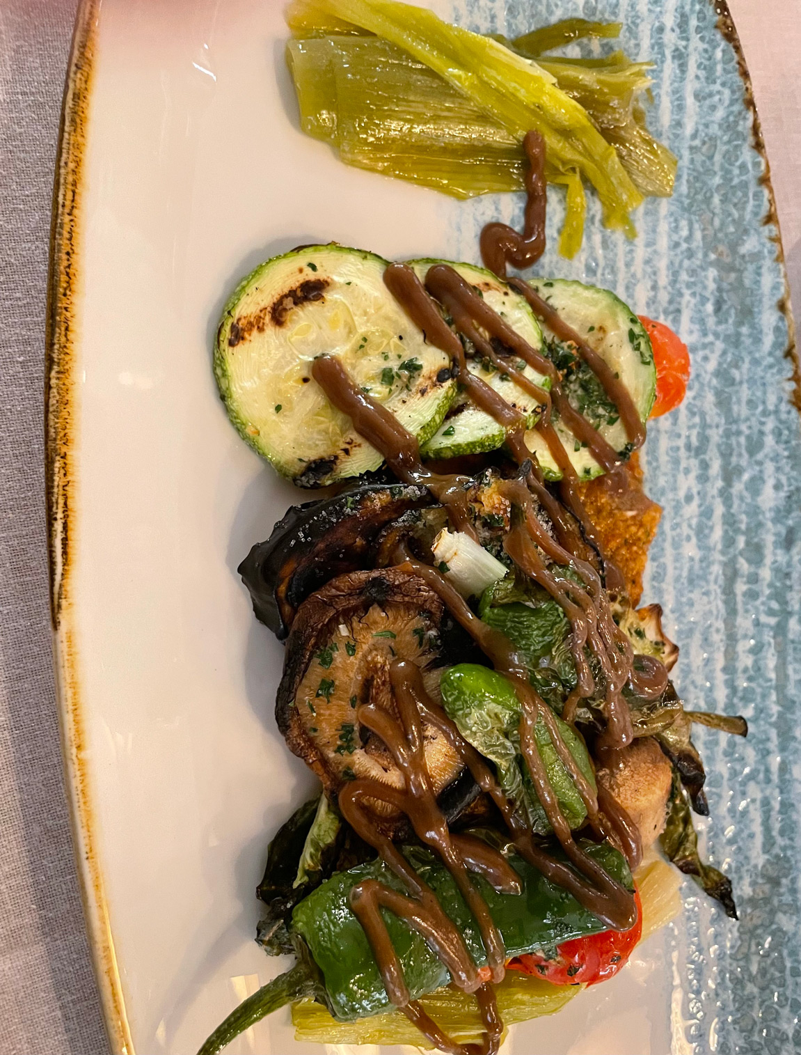 Our starters were a fresh-tasting salad with goat cheese, textures of honey and seeds (18€), and an appealing selection of seasonal grilled vegetables with red pesto and a vegetable demi-glace (16€). Both were excellent and either would be shareable.