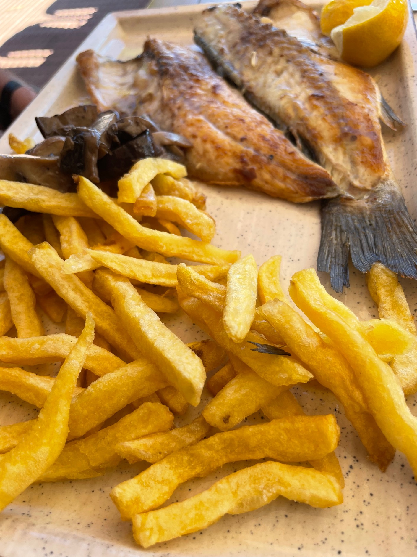 For our mains, I had grilled salmon on a bed of mushroom and spinach risotto (26,50€). The salmon was decorated with piped soy mayo – something I’d personally have preferred on the side of the plate and unfortunately scraped off the fish before taking the photo. My husband chose grilled sea bass, with confit garlic (again he declined this), sautéed spring onion and mushrooms, and mashed potatoes (25,90€). He explained to our helpful server that he doesn’t like garlic, and after taking our order to the kitchen, she returned to inform us that the mash contained some garlic. French fries were substituted with no fuss.