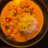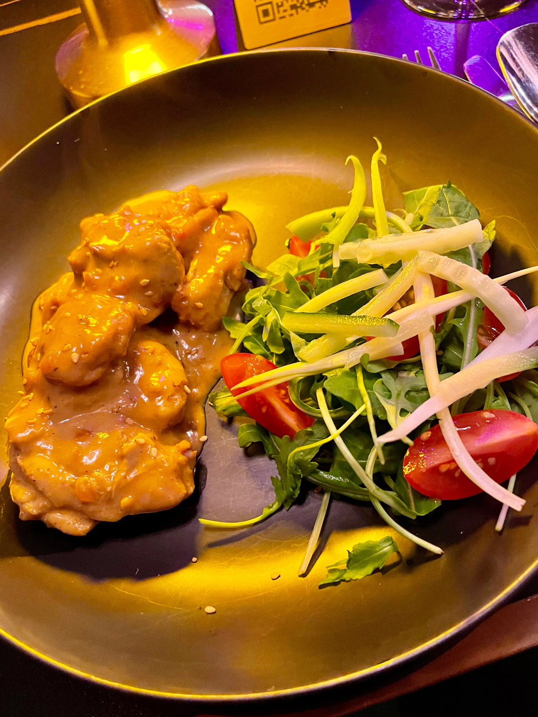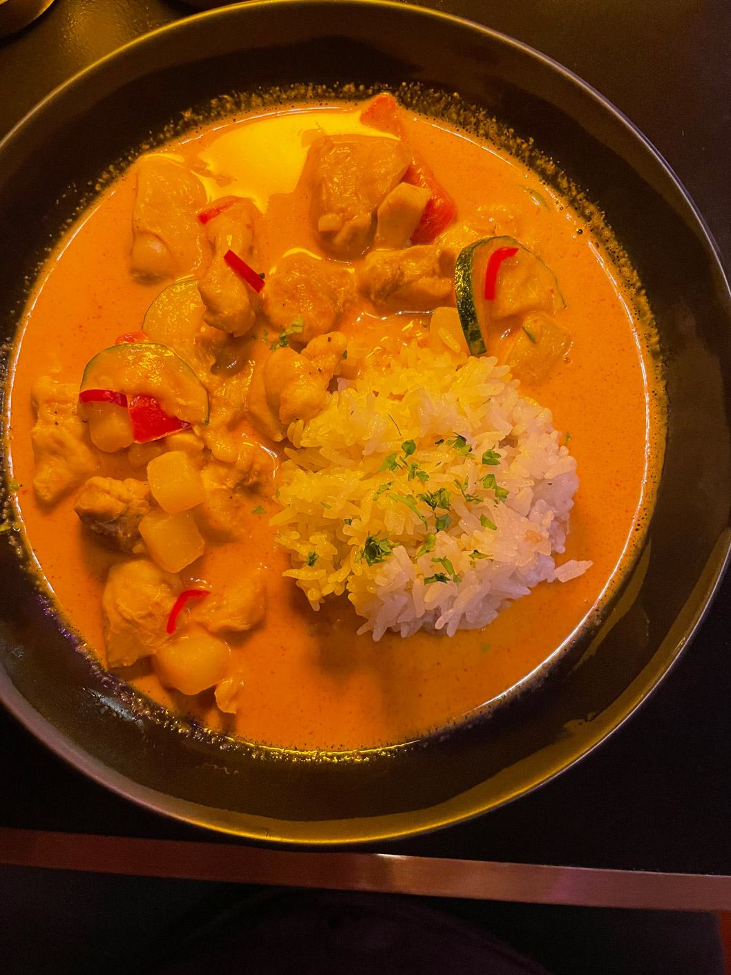 The menu offers five starters, priced between 5€ and 7,50€. All sounded tempting, but we finally chose confit duck tacos with an Asian-style salsa and chicken satay with peanut sauce. A flavoursome start to our dinner. Next, it’s a build-your-own-curry main course. No, you don’t have to squeeze into the kitchen to assemble your dish, but place your order with Annika from the hotel, who was working front of house that night. You choose from chicken, pork, or vegetables, and add yellow, red, or green curry sauce, and your choice of coconut rice or egg noodles. Eh, voilà. Annika warned us that the green curry sauce was very spicy, so I opted for the red, which was the perfect degree of spice for my taste. Whichever curry you choose costs 12€ and the rice or noodles are 4€.