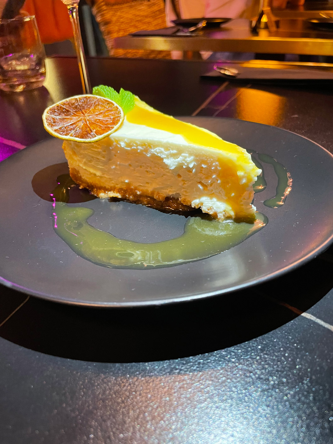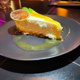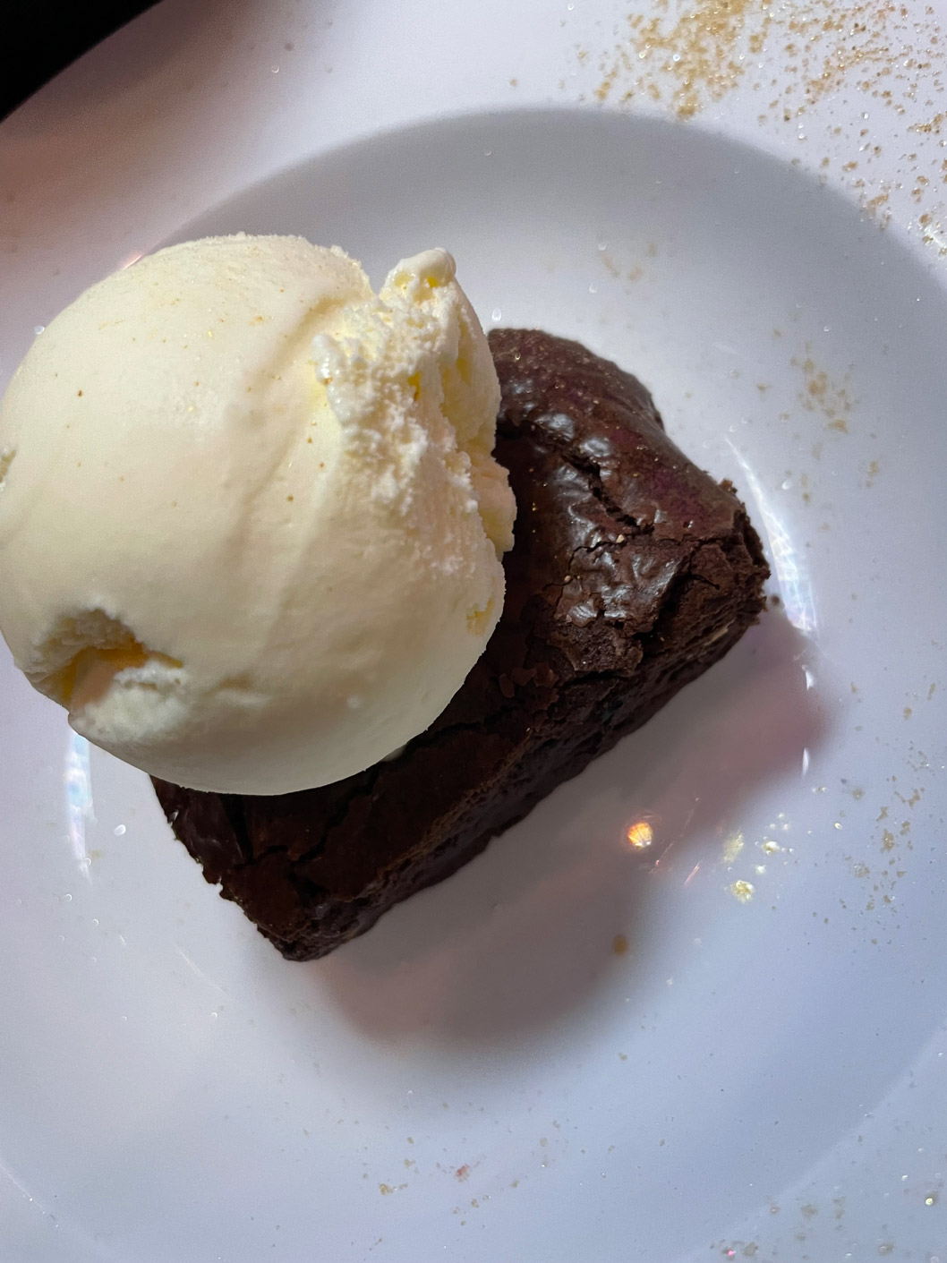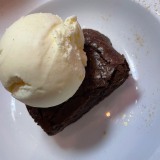 Two home-made desserts are on the menu: warm, three-chocolate brownie with vanilla ice cream (6€) and baked cheesecake with passionfruit (6€), so we had one of each. My cheesecake was silky smooth.
