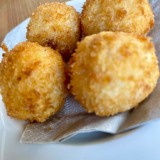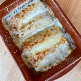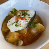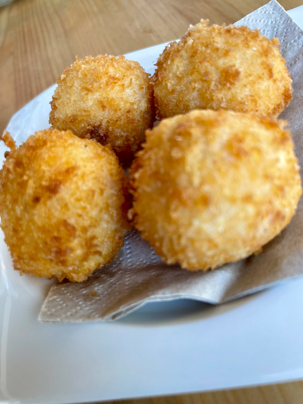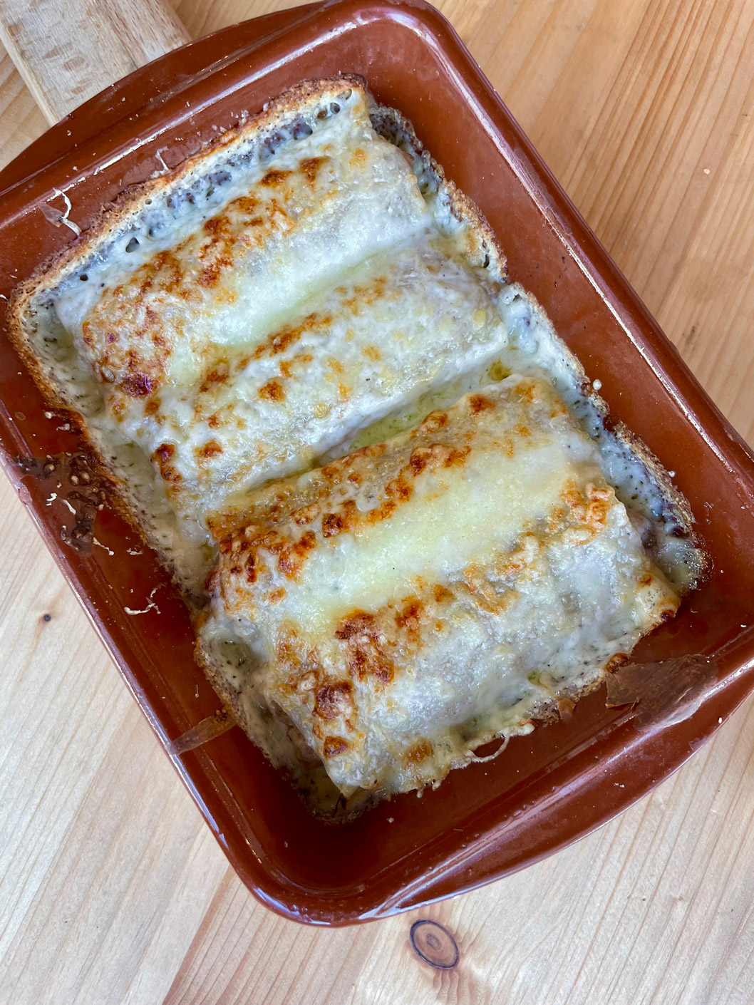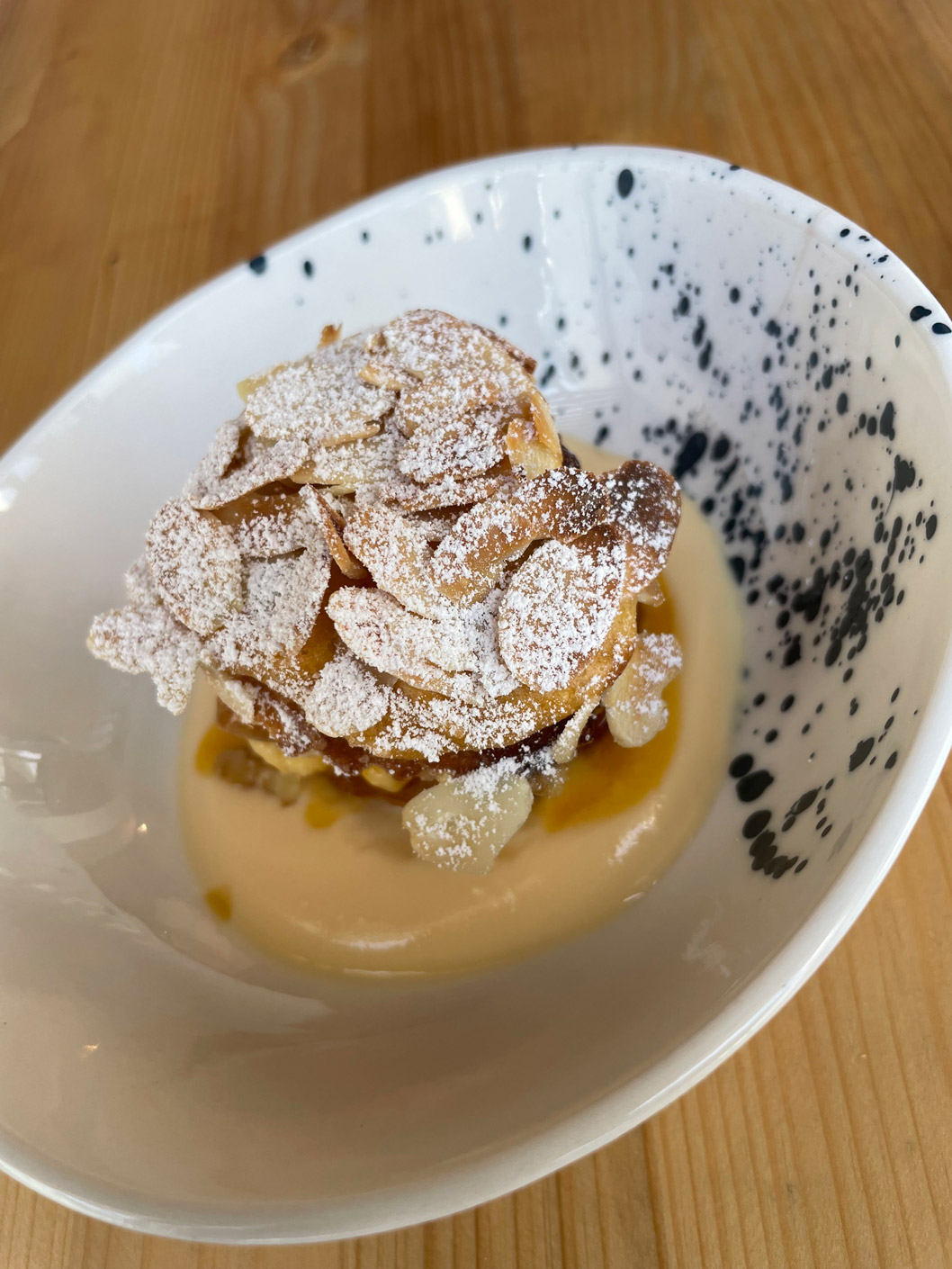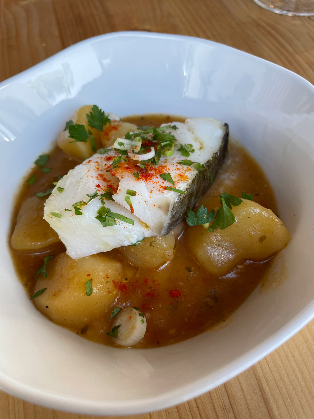 Our lunch began with the ‘croquetas’ of the week, which were of cheese and sobrasada. Next was a carpaccio of thinly sliced Portobello mushrooms with a turmeric sauce. Tomeu is renowned for his cannelloni – there’s usually one on his Tomeu Caldentey Cuiner tasting menus; we had a three-meat-stuffed cannelloni au gratin with Menorcan cheese, brought in a piping-hot dish to share. Delicious. Perfectly cooked cod in a sauce with potatoes (‘suquet’) was our final savoury dish, served in warmed bowls.