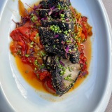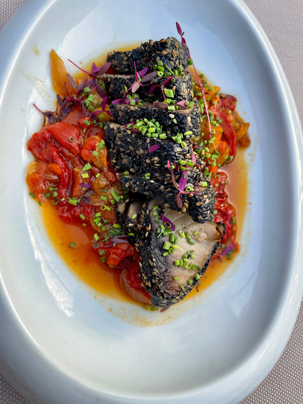 I chose skate as I don’t often see it on restaurant menus. The succulent fish was cooked over fire and served on a bed of chopped tomato, spring onion, and black olives, topped with a generous heap of crispy fried onions (22,80€). My only constructive criticism would be that pre-warming the plate would have kept the food hotter for longer. My companion chose seared tuna on roasted peppers (24,50€); our server asked him how he’d like it seared, and the tuna that arrived at the table was exactly as he’d wanted it.
