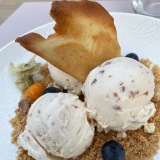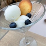 From the five desserts (8.90€-10,50€), I chose Juan’s excellent home-made almond ice cream, with candied almonds. The portion was generous and well worth the 9,50€ this delicious dessert costs. My companion had sorbet (8,90€) served with a tuile biscuit and a blueberry garnish.