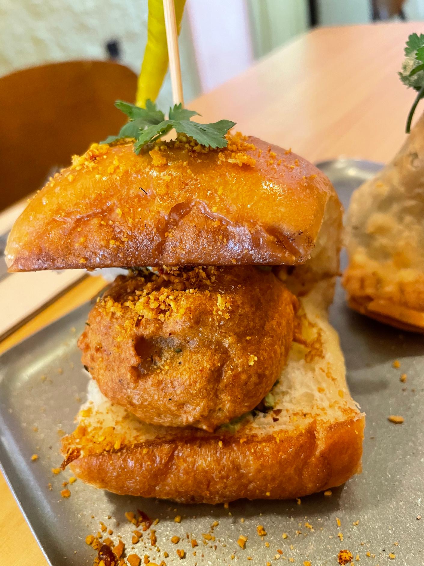 To enable me to try a few items as I was eating alone that day, Annie suggested a taster of three from the snack menu: one of their unmissable, home-made aloo samosas of spiced potato and peas (5€); vegetable pakoras – a staple in Indian homes (5€) – and vada pav, a delicious chickpea-battered potato fritter in a soft bun, with garlic chutney and tamarind, and speared with a pickled green chilli (10€). Tamarind, mint, and mango sauces accompanied these three expertly spiced – and satisfying – delights.