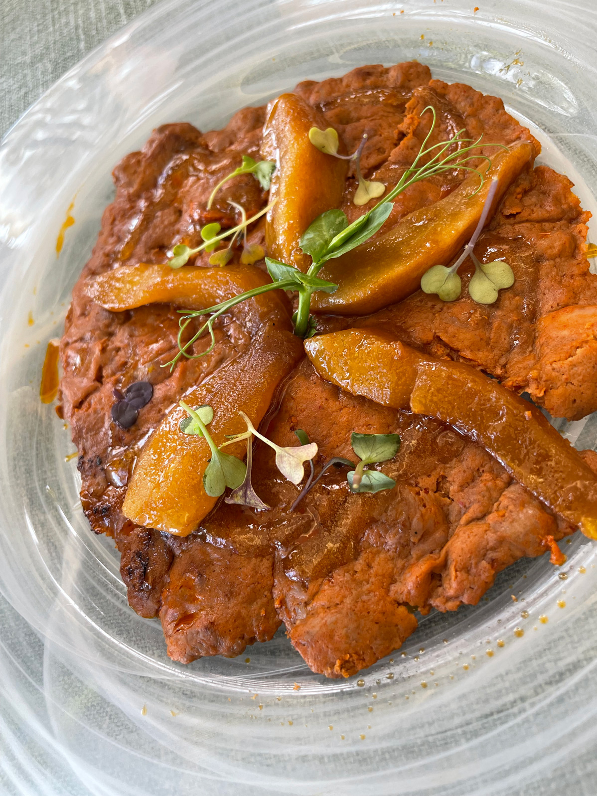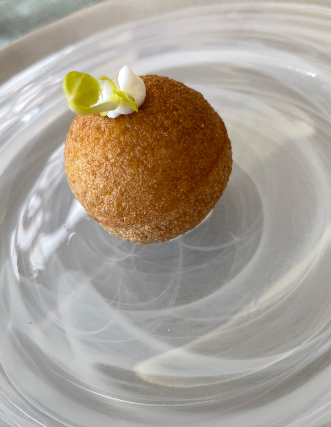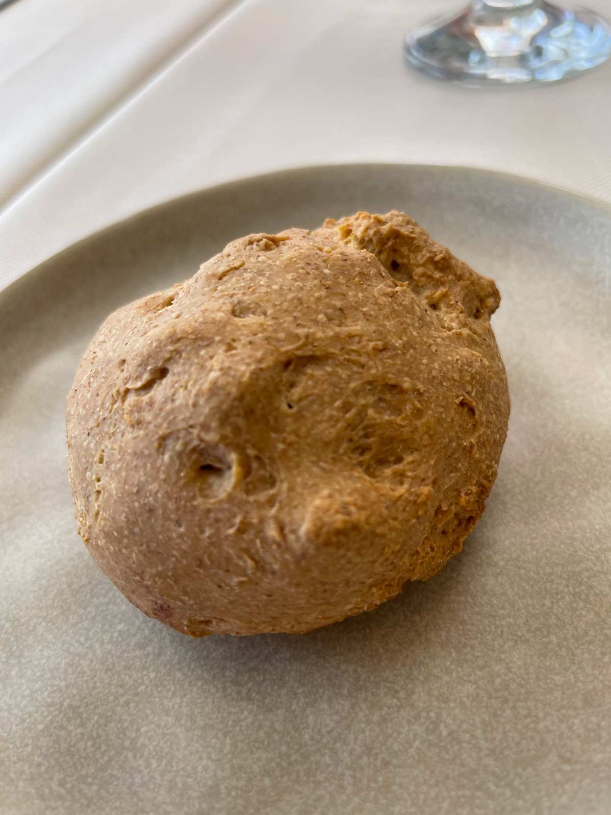 Once our order was placed, the friendly Mallorca maître, Joan, brought us warm, home-made xeixa-wheat bread rolls. Extra virgin olive oil from the nearby Finca Treuer and salt flakes complemented the good crust and crumb of the bread. A complimentary appetizer, looking like a croquette, arrived. Expecting it to be hot, it was a surprise to find that it was intended to be cold, because it contained potato and alioli. I’ve never liked cold potato dishes – despite their resistant starch properties – so, because of personal taste, this wasn’t a big hit with me.