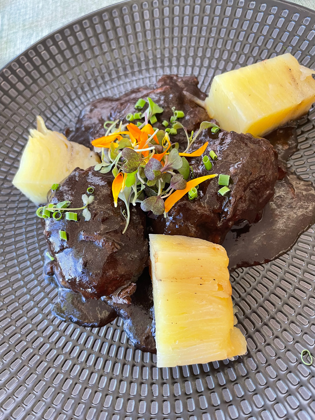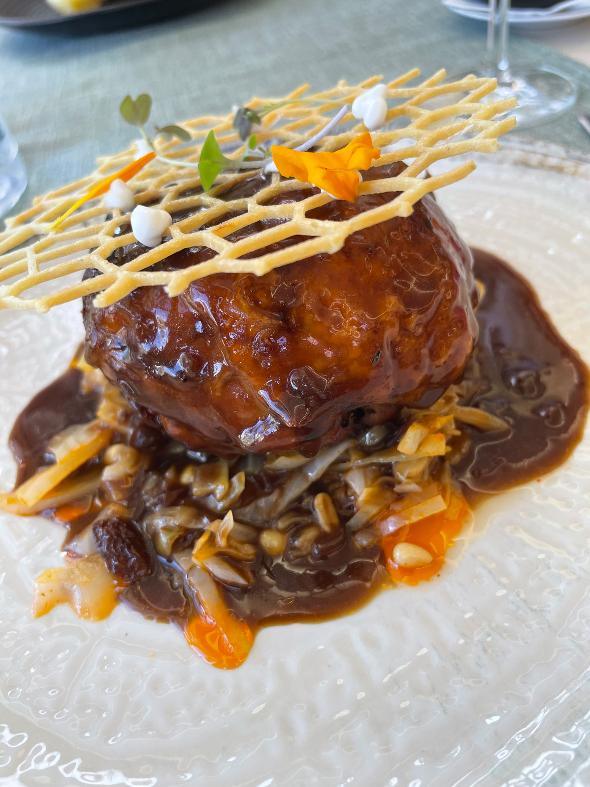 I enjoyed my visually appealing starter of beetroot ‘ravioli’ with goat cheese and pistachios (12€) – three ingredients that always work well together. My companion chose duck ‘sobrasada’ with orange marmalade and segments (15€). Its description in English reads ‘Memories of the traditional slaughter amid laughter and winter sun’ – which probably wouldn’t sound as appealing to British holidaymakers dining here as it would to locals, for whom the annual ‘matanza’ to make sobrasada is a traditional family-and-friends event. Despite that, my companion enjoyed this different interpretation of sobrasada.