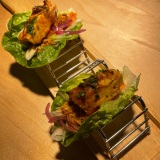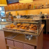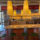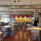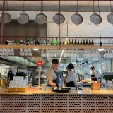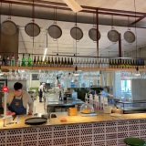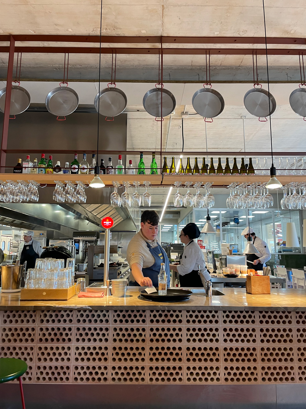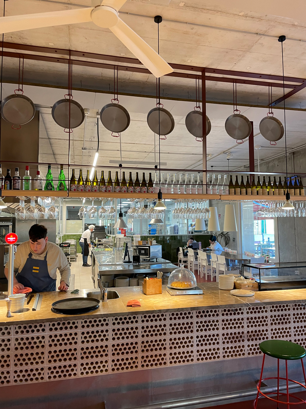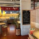 The large interior has an open kitchen at one end and an industrial-chic decor, with attractive lighting, a variety of seating options, and red brick and exposed concrete walls. The ambience was inviting. For those who like to watch their food being prepared, there are stools at the kitchen counter.