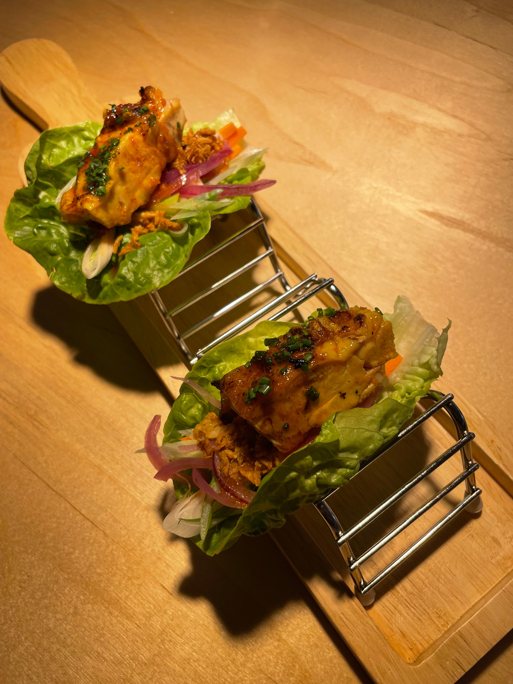 We each began with a baby lettuce leaf taco filled with chicken and vegetables (4€), noting the freshness of the vegetable elements. There are similar tacos with lamb or smoked salmon. Of course, we didn’t miss the opportunity to have a basket of Can Pa bread (3,25€) and, when we didn’t finish it, our server offered us a paper bag so we could take what was left home.