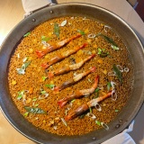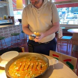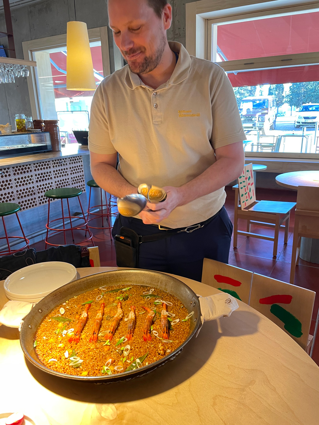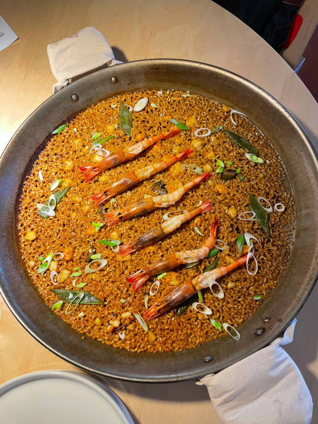 Café Inca has a Kamado grill, and we were tempted by the dishes from that (14€-22€), but seeing the number of paella pans suspended from the kitchen ceiling, we shared a rice dish with calamari and red prawns at 19€ each. As in many restaurants, the rice dishes are for a minimum of two people.
