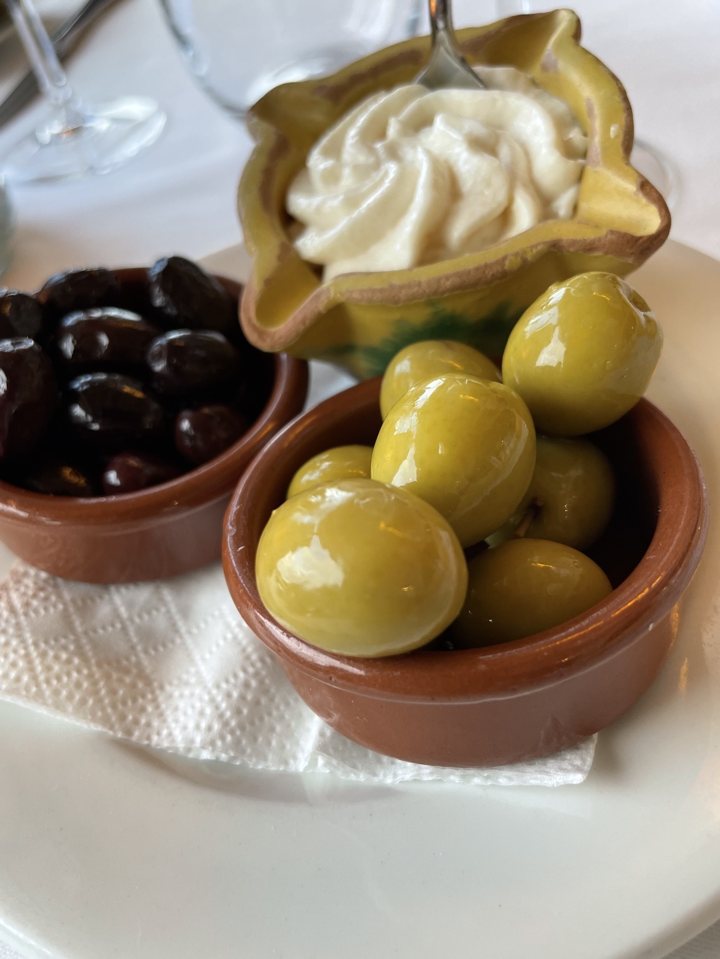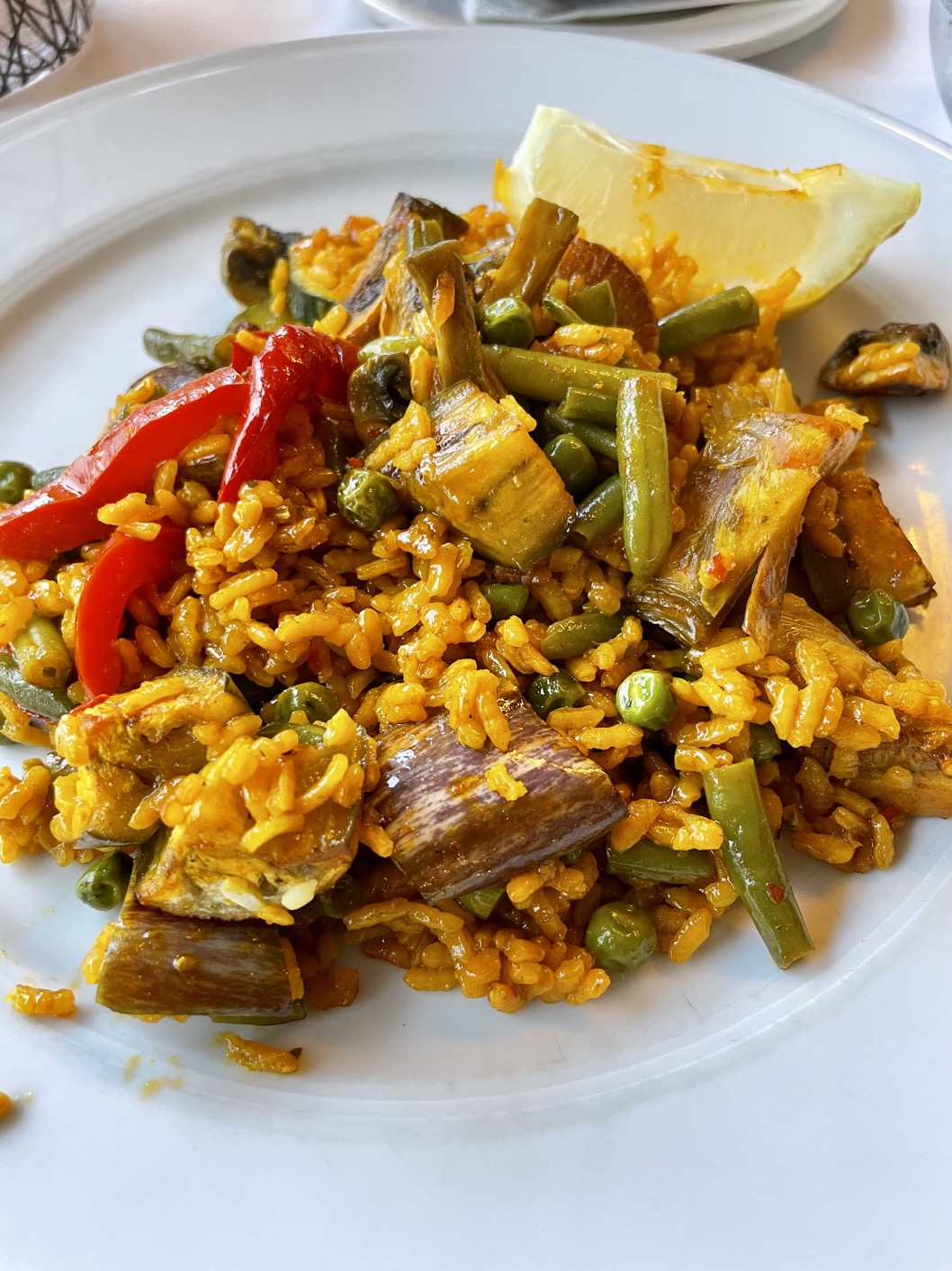 My friend and former workmate wanted paella, but her chef husband chose fish, so although I don’t usually eat paella at dinnertime, I offered to share one with her, and she chose the vegetarian version – a generous one it was too. (17,50€).