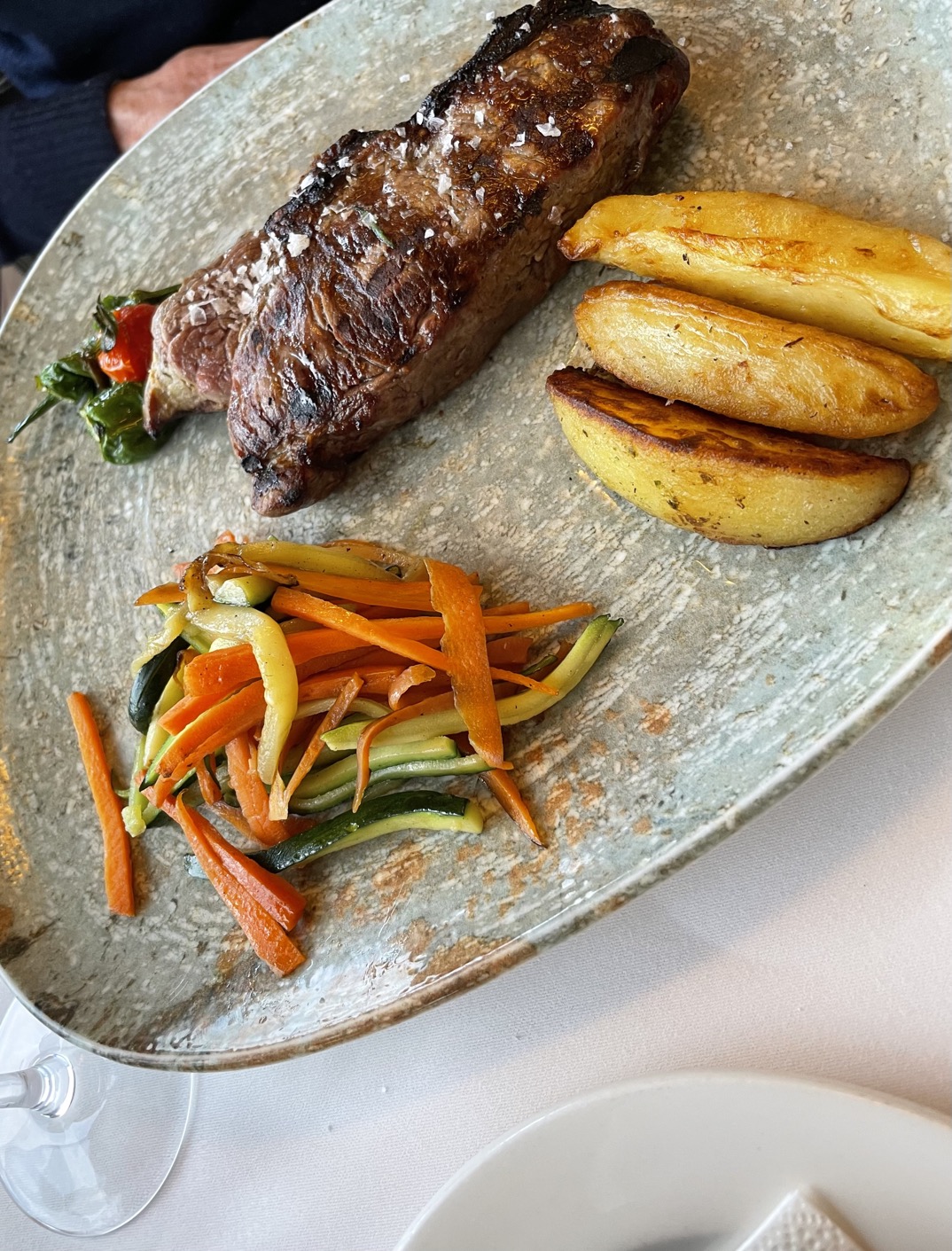 Her chef husband enjoyed his cod fillet with sobrasada and honey (25,50€). My husband had a decently cooked Black Angus entrecôte from Ireland (29,50€).