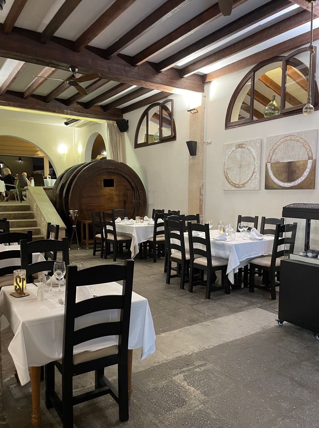 Ca’n Josep has several eating areas: an indoor ‘terrace’ with picture windows giving views of the beautiful Bay of Pollença across the road; an outdoor terrace at the side of the premises, and – a few steps down at the rear of the restaurant – an area typical in its décor of the cellar restaurants that have long been a feature of Mallorca.