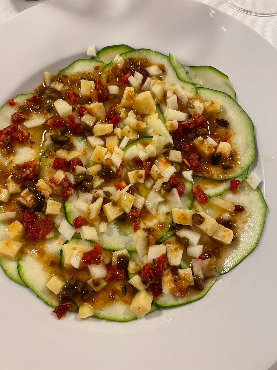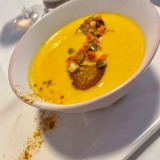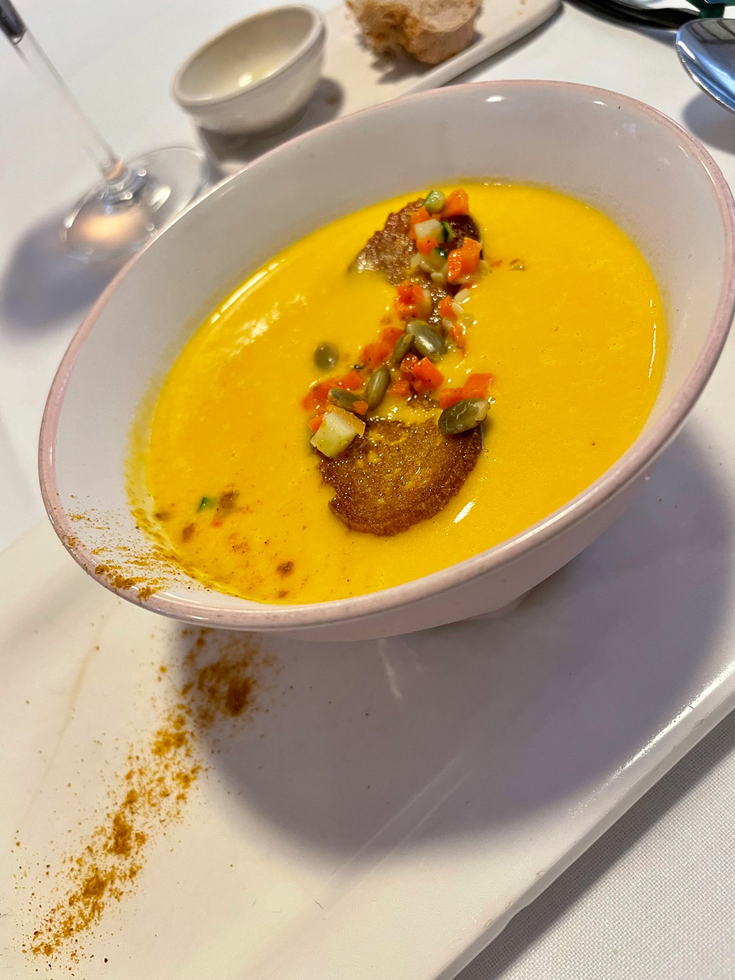 This being autumn, we were seduced by the prospect of pumpkin soup. Tasty and satisfying, it had a hint of curry and was topped with pumpkin seeds, finely diced vegetables, and a crouton. True comfort food.