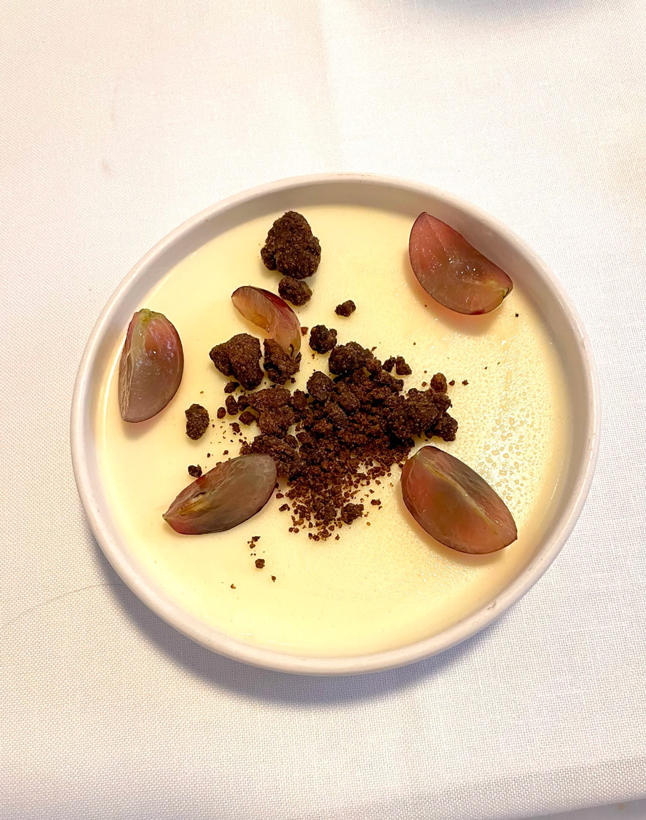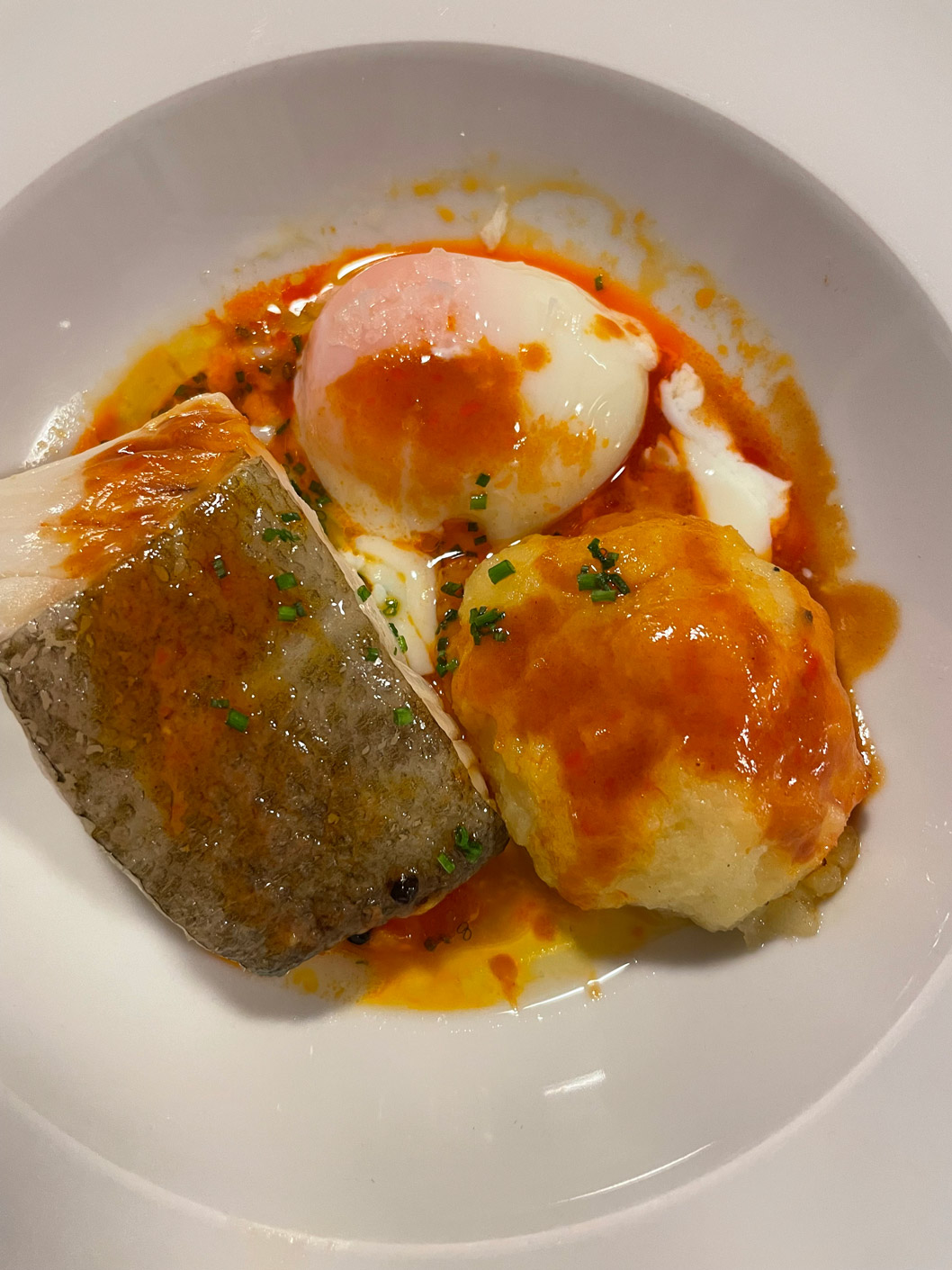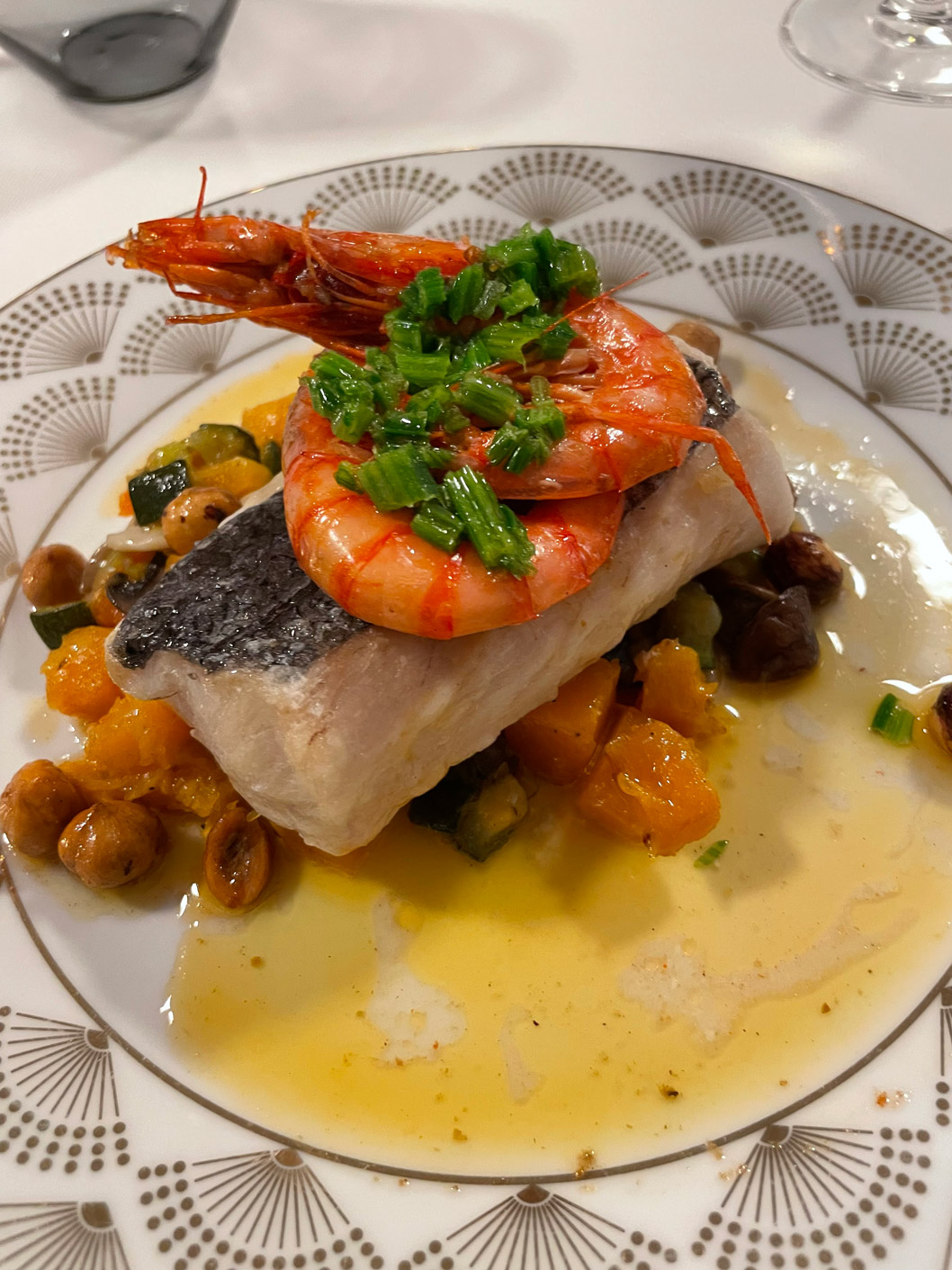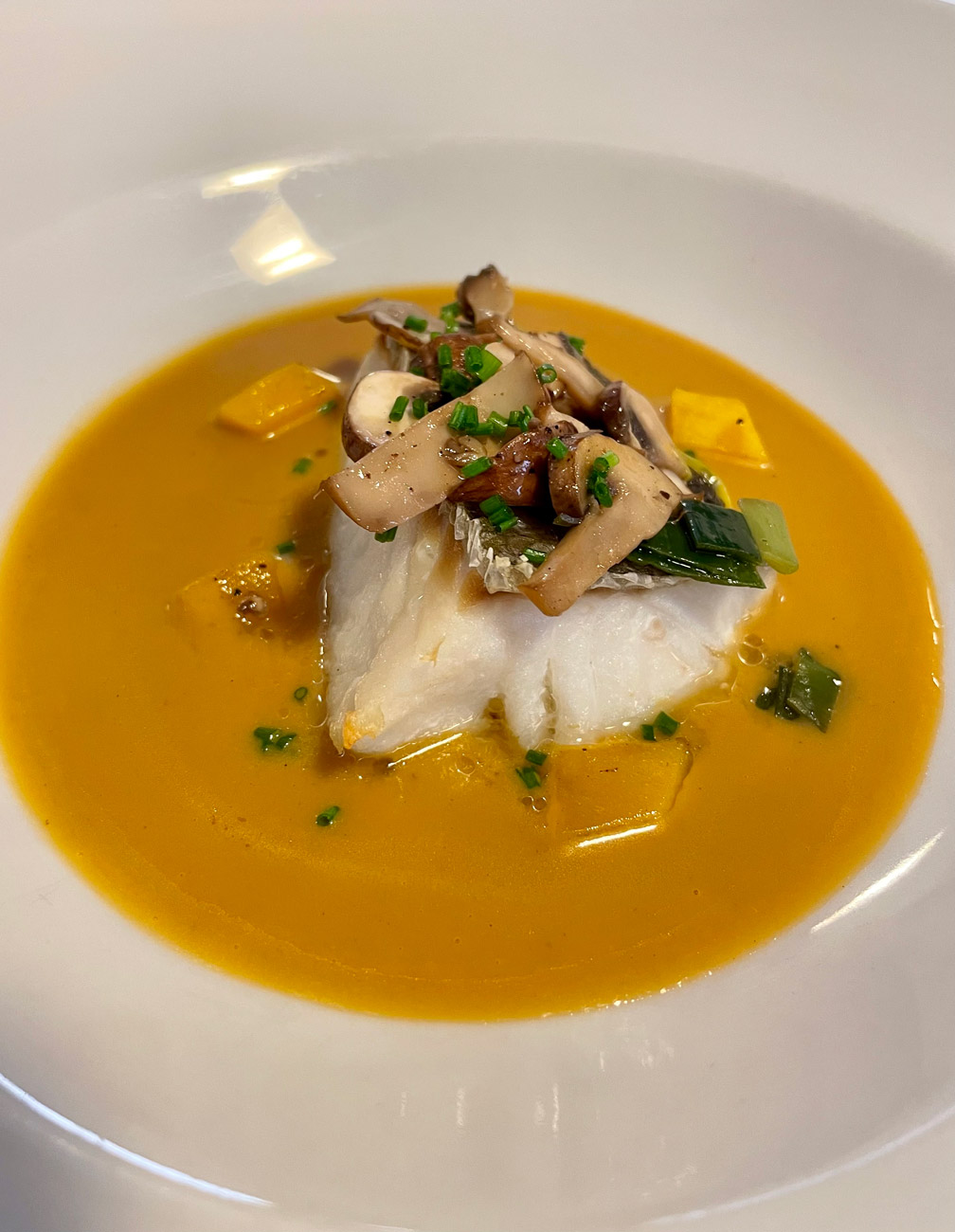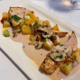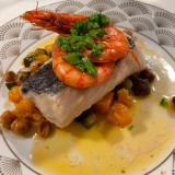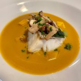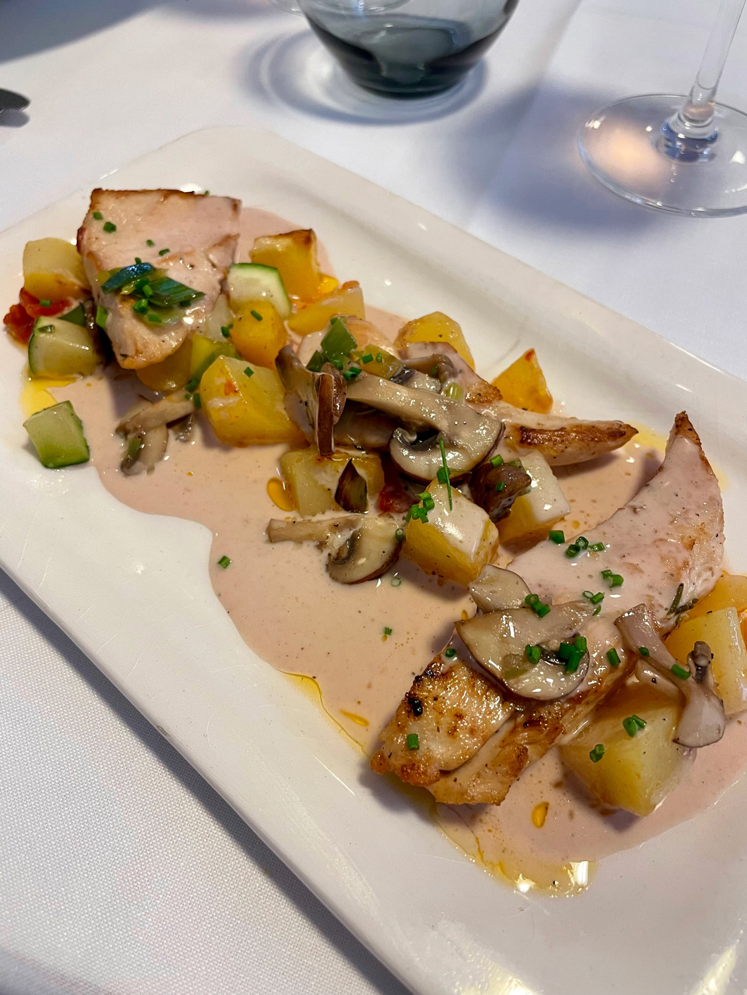 Our main courses were perfectly cooked cod and a chicken breast with vegetables and baked potato pieces in a foie sauce. Both were delicious and reminded us yet again how lucky we are to have this restaurant in our nearest town. A creamy ‘cheesecake’-type dessert was the perfect finish to an excellent lunch, with good service.