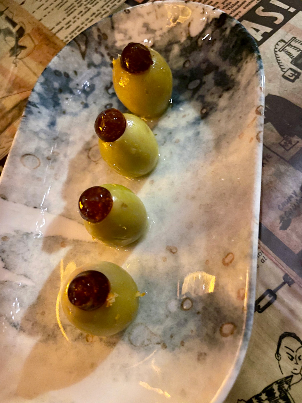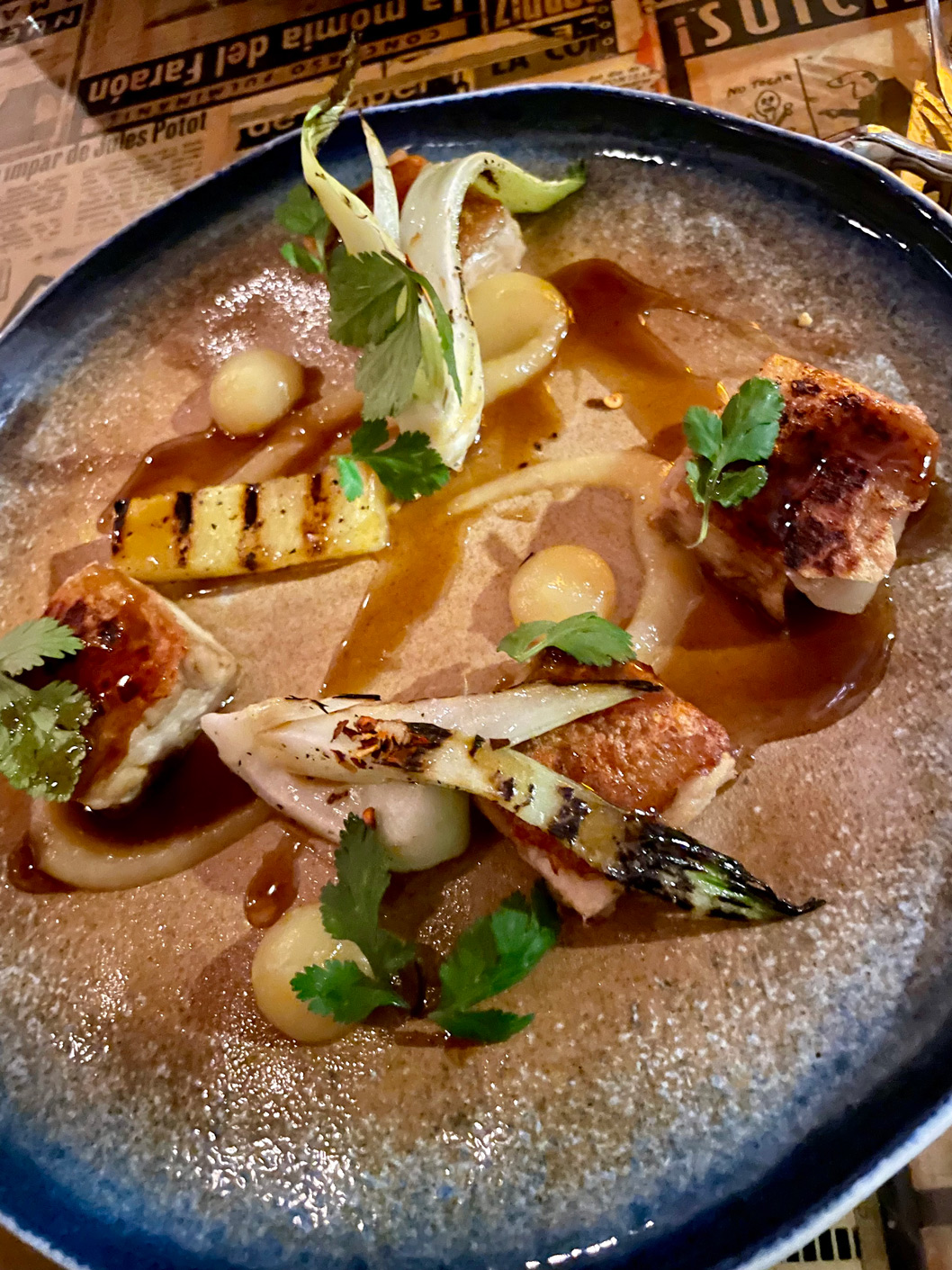 We decided to try the tempting tasting menu on a future occasion, giving us an excuse to return soon, and spent time deciding what to choose from the á la carte menu. It’s all very appealing. We started with fat, juicy gordal olives stuffed with vermouth gel – so good I think that even those who don’t care for olives would enjoy them.
