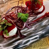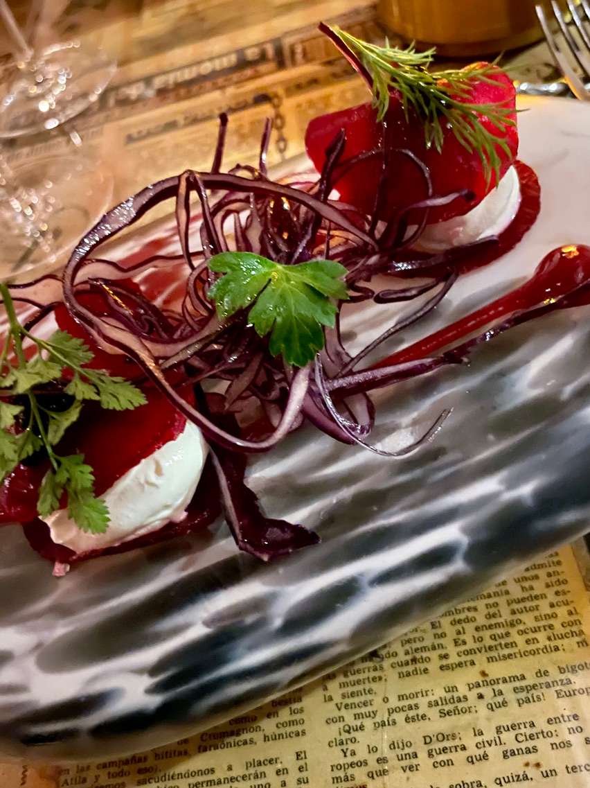 Then we had two dishes from the ‘Light Bites’ section: beetroot ‘ravioli’ (14€) and red prawn tacos (2 for 22€). Both were real pleasers and Canela’s friendly Swedish manager, Camilla, told us the beetroot dish is one of their most popular. Despite its name, there was no pasta in the beetroot dish, which included creamy, soft cheese, raspberries, and pistachio. The flavours and contrasting textures make this a must-order dish.
