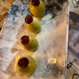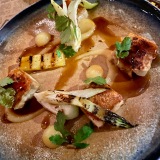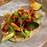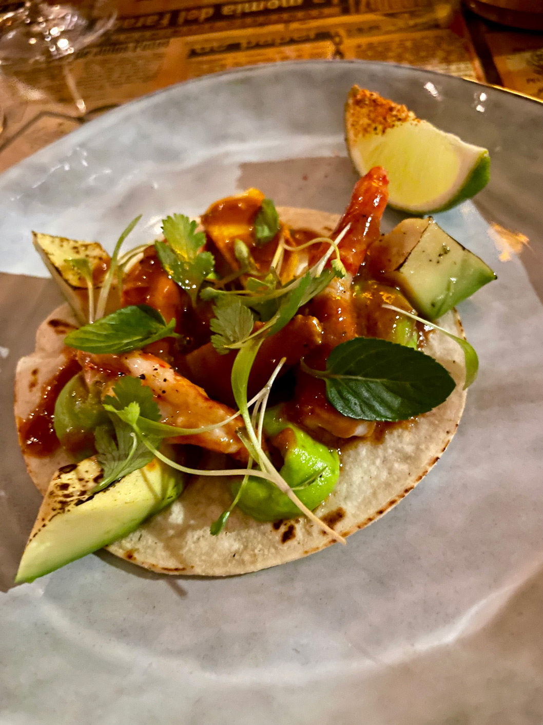 The prawn tacos included avocado two ways, smoked vanilla oil, and a slice of lime. Another delicious and appealingly presented dish.