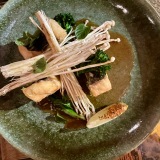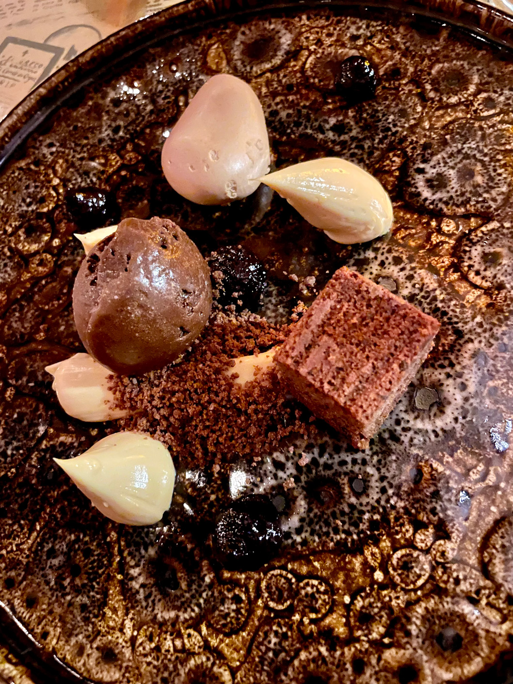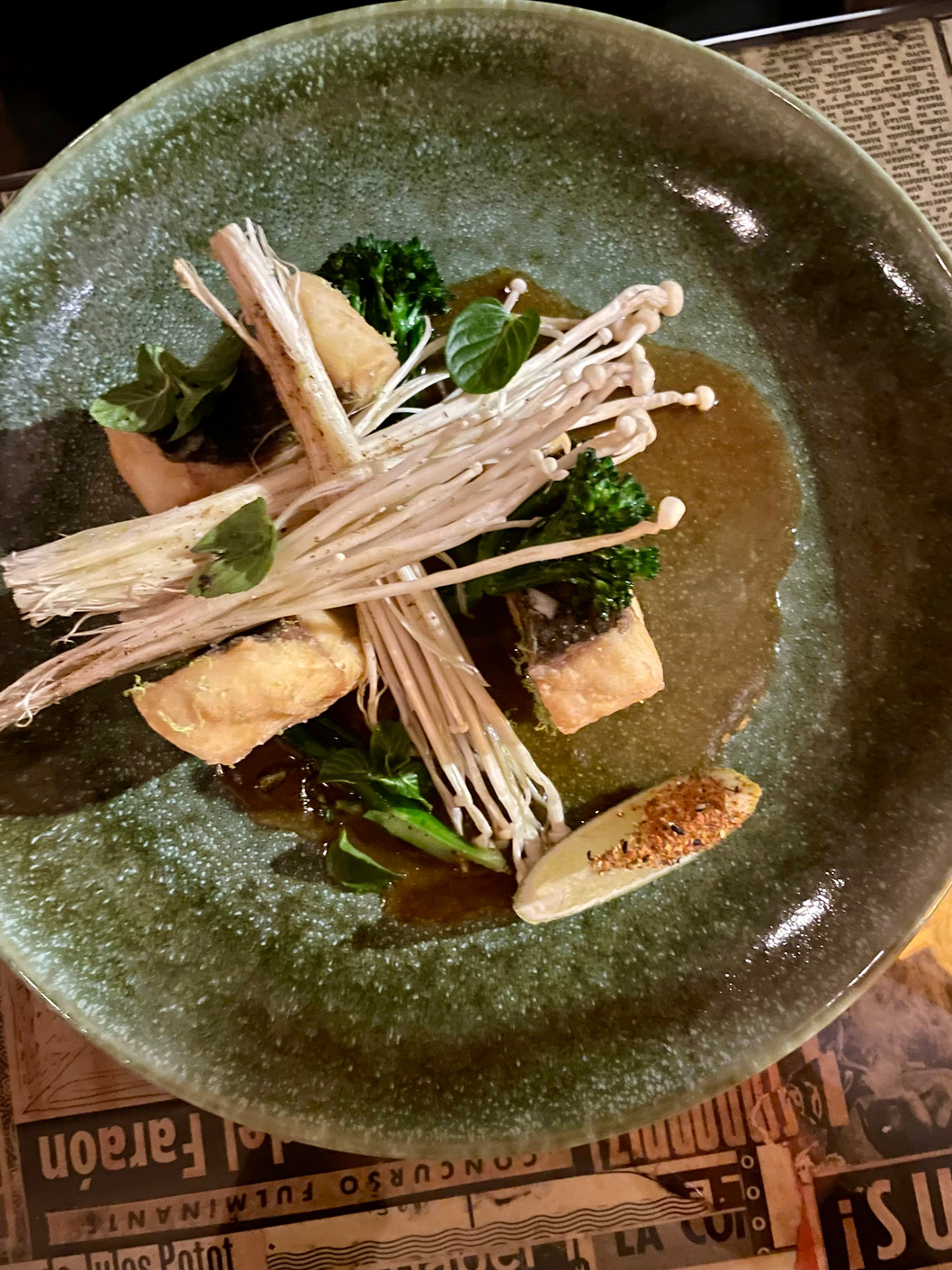 From the large plates section, I had tender confit suckling pig with pineapple two ways (puréed and roasted in the Kamado oven) and pak choi with notes of orange and chilli (28€). My companion chose fried seabass, with enoki mushrooms, bimi, and peanut sauce (32€). Both the main plate dishes were served on warmed plates – a bonus point from me.