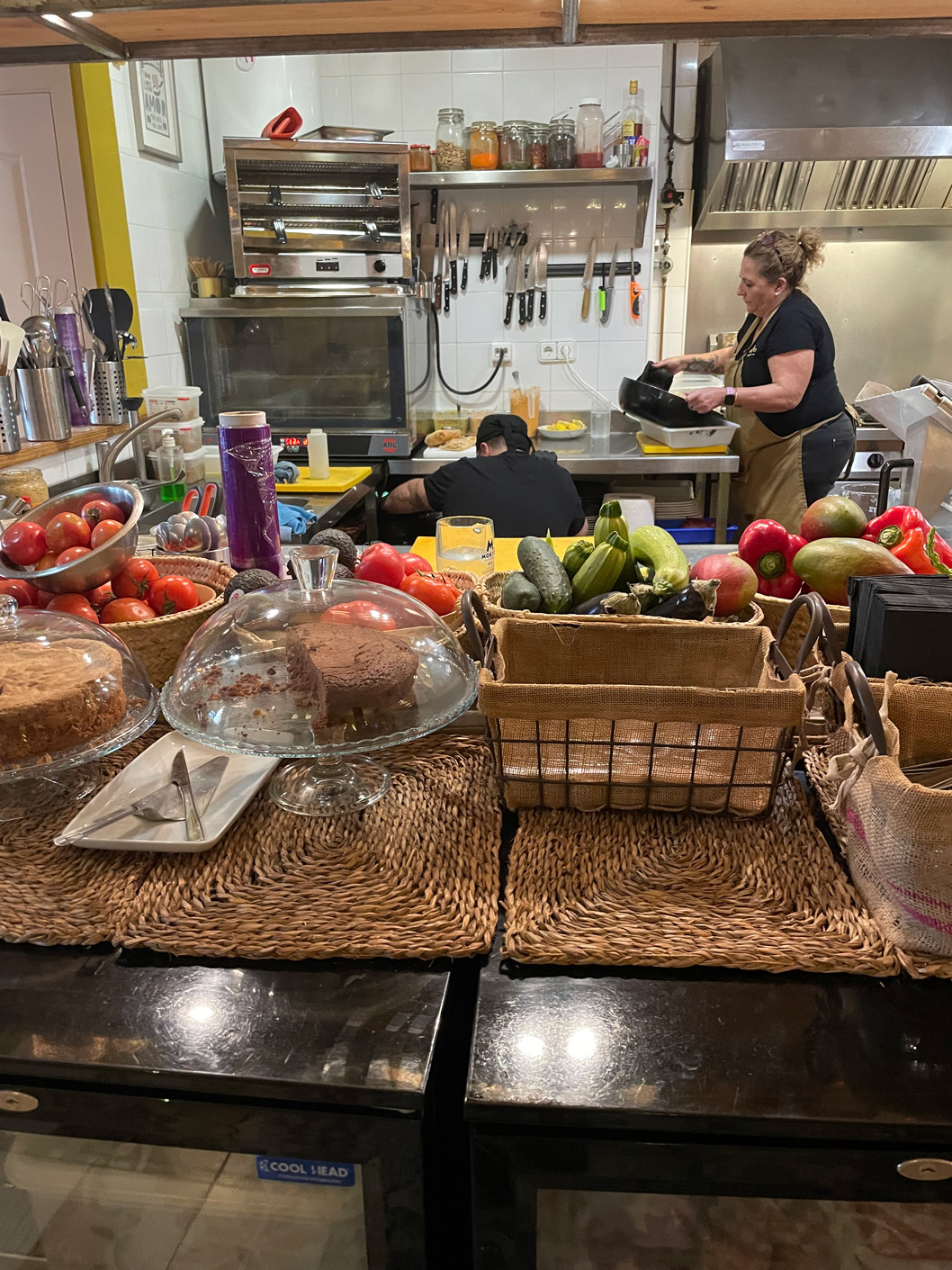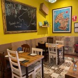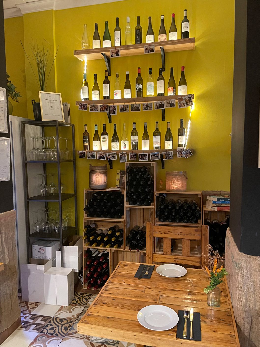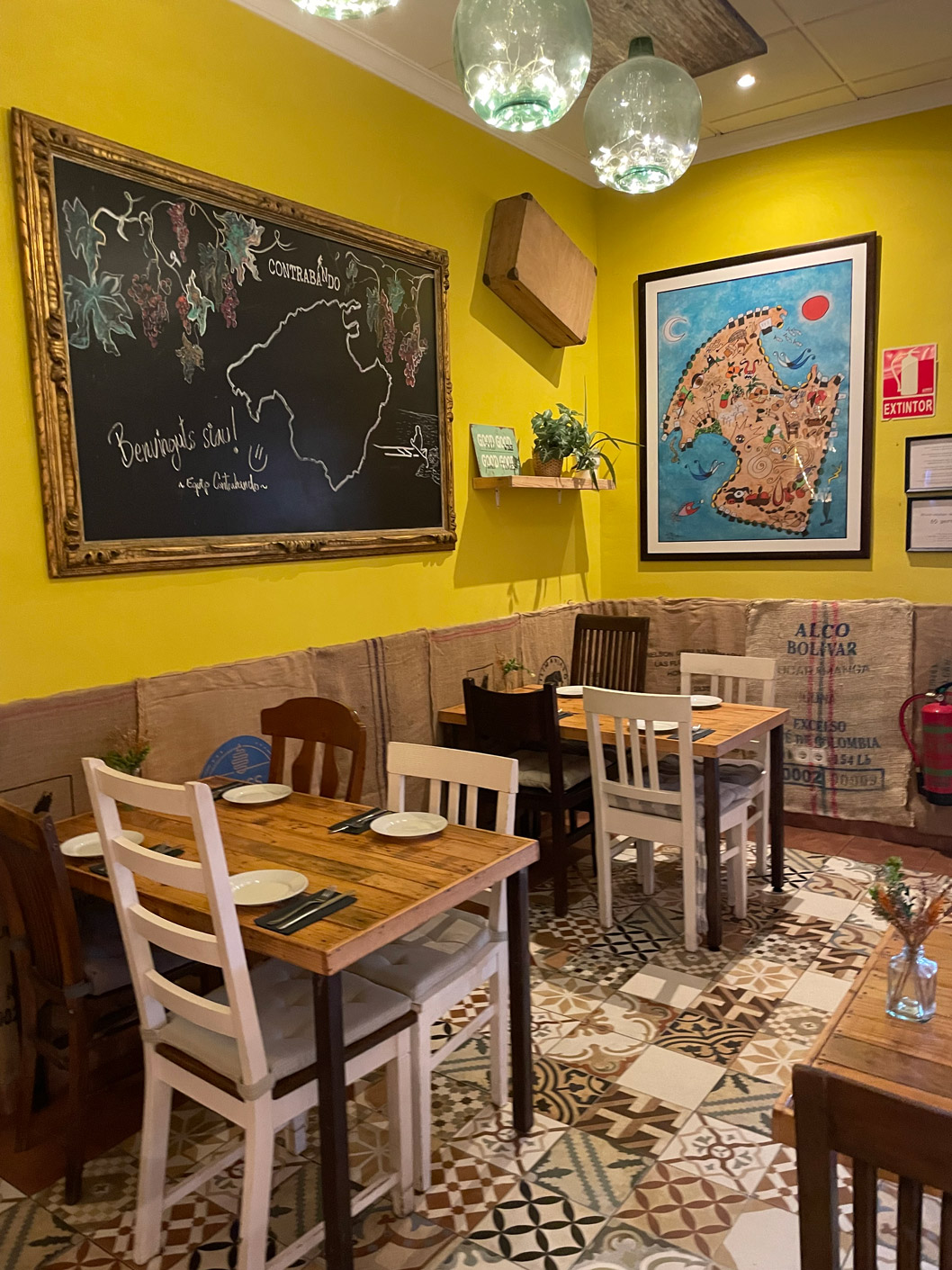 The décor has a good ‘mallorquín’ character, with sunshine-yellow walls, patterned floor tiles reminiscent of traditional local tiles, displays of wines, attractive lighting, mismatched chairs, and a bicycle strung with lights hanging on a wall. At the heart of Contrabando is the open kitchen. For those who like to be outdoors, there’s a small pavement terrace at the front.