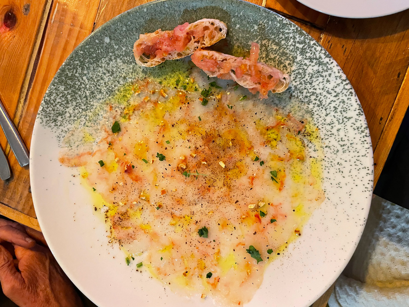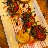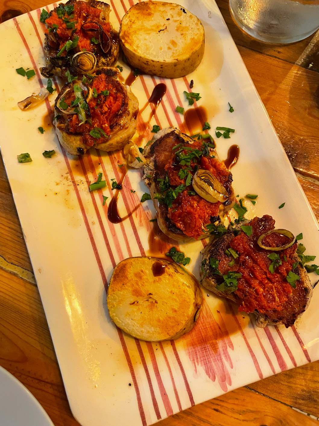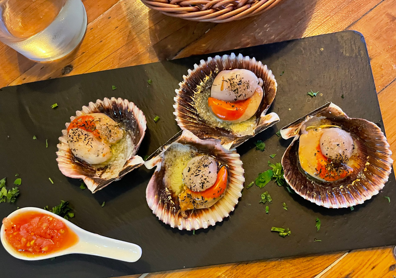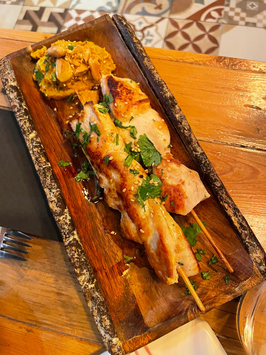 We shared a few dishes, starting with bread and very tasty, marinated olives. I can recommend the carpaccio of red prawns Contrabanda-style (25€). Then we turned to their signature tapas: gratinated queen scallops with a spicy sauce (3,50€ each), two skewers of chicken with a tasty and different ‘satay’ sauce made from Mallorcan almonds (10,50€), and medallions of tender pork fillet topped with grilled sobrasada and artisan honey (13,50€). For dessert, we had tiramisu and banoffee.