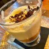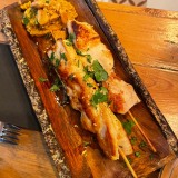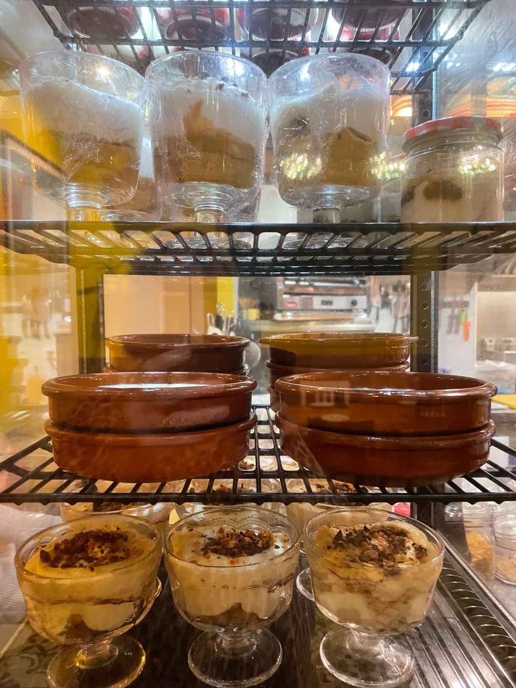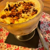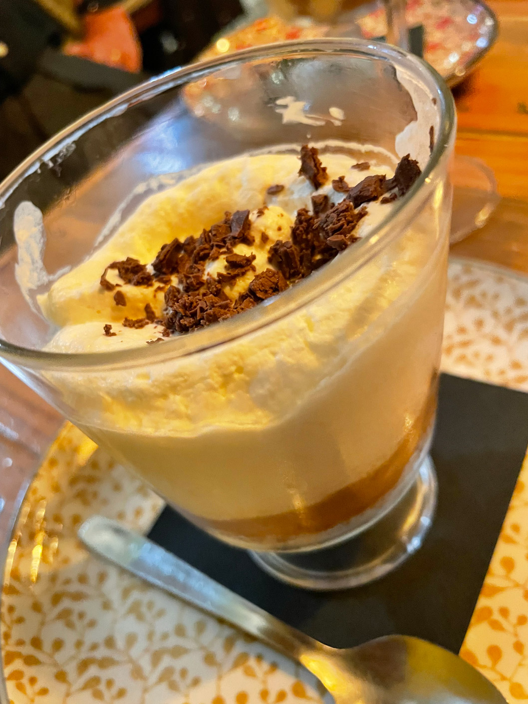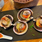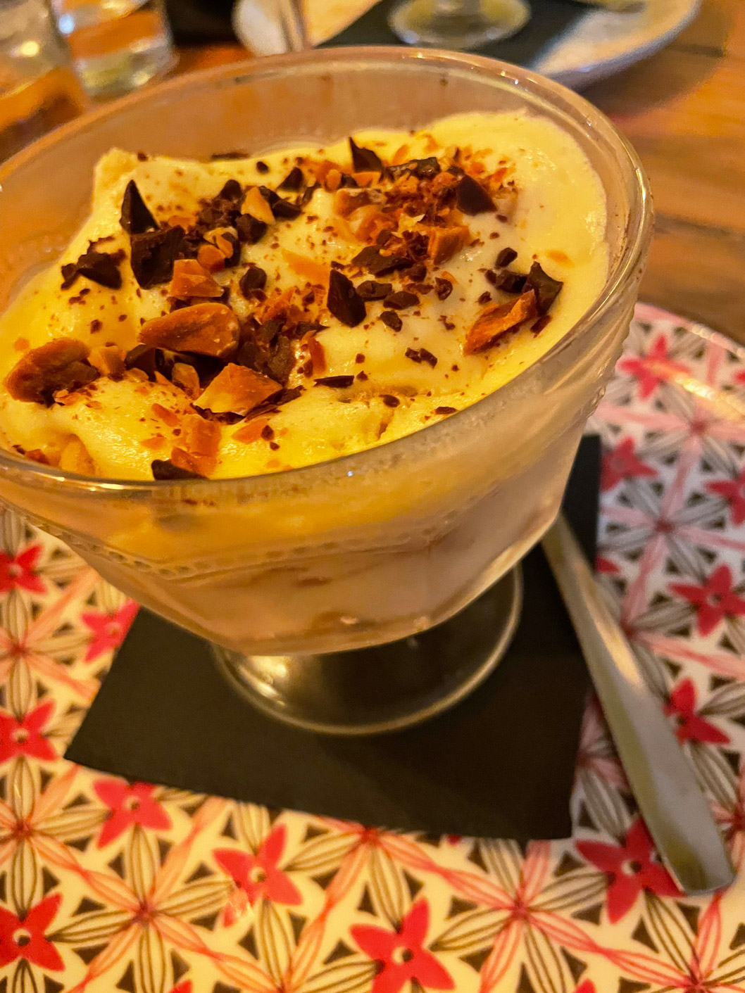 We shared a few dishes, starting with bread and very tasty, marinated olives. I can recommend the carpaccio of red prawns Contrabanda-style (25€). Then we turned to their signature tapas: gratinated queen scallops with a spicy sauce (3,50€ each), two skewers of chicken with a tasty and different ‘satay’ sauce made from Mallorcan almonds (10,50€), and medallions of tender pork fillet topped with grilled sobrasada and artisan honey (13,50€). For dessert, we had tiramisu and banoffee.