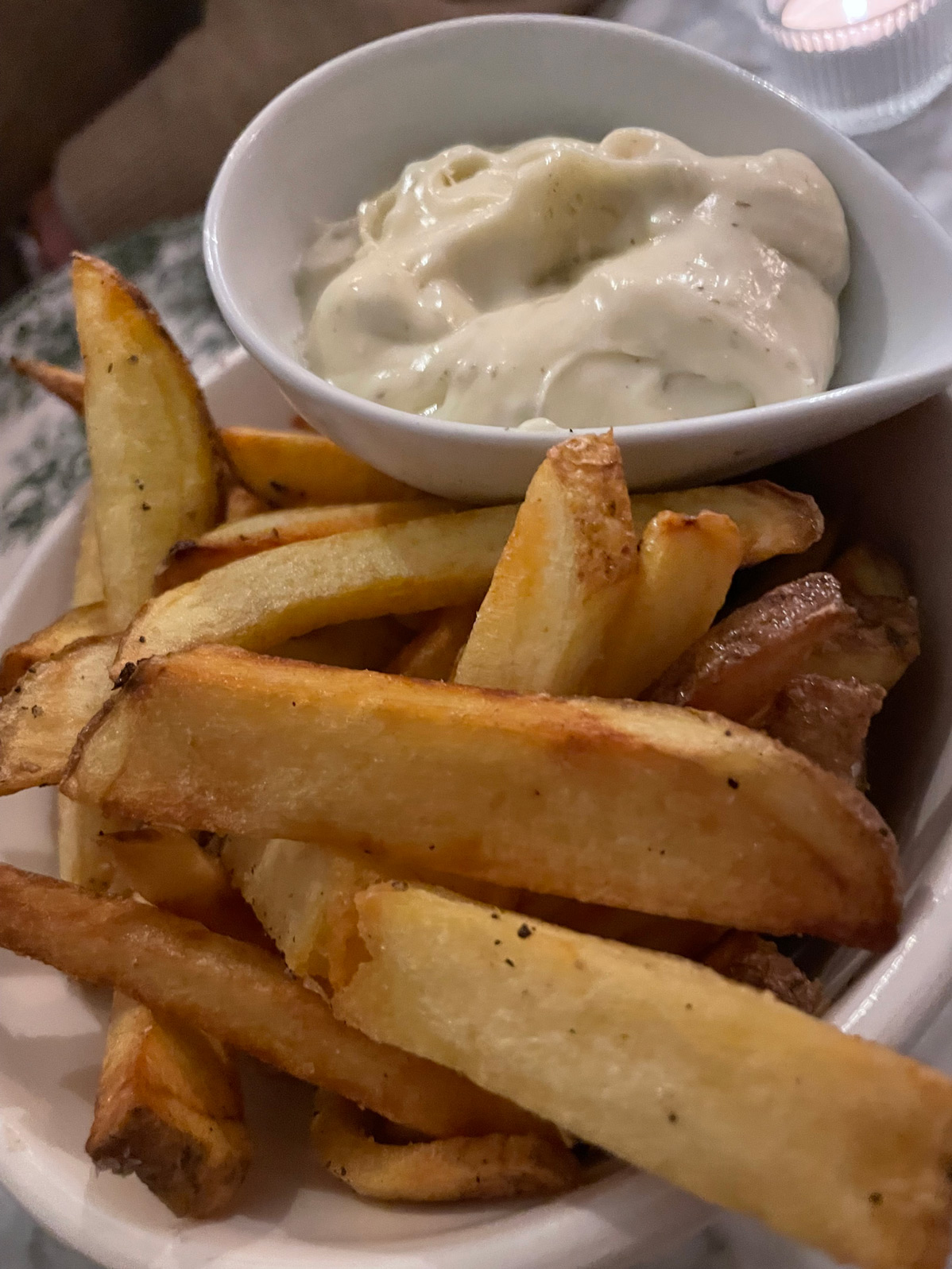 After several visits here, we’ve tried quite a few of the regular menu dishes, but have never missed the chance to share an indulgent portion of the home-made French fries with a side of Béarnaise sauce (8€). We’ll try the home-made Iberian pork dumplings with spiced oil (5 for 12€) on our next visit.