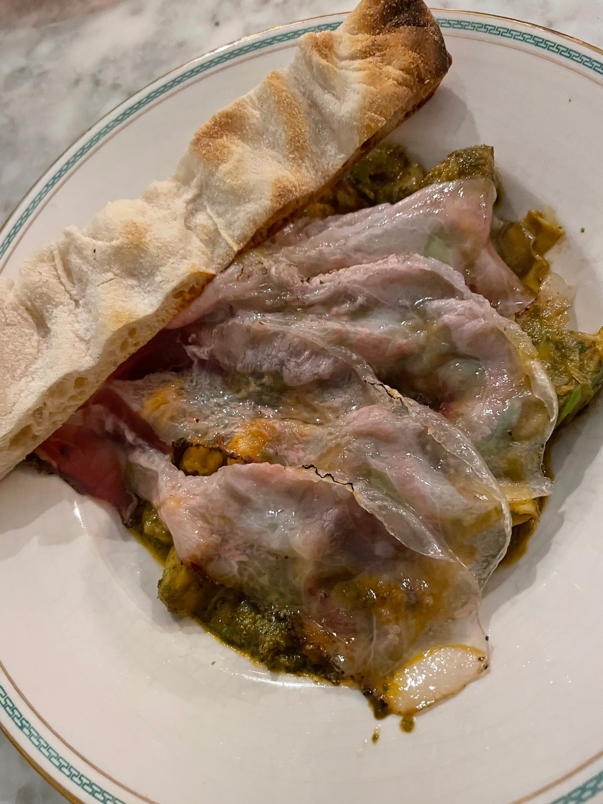 The blackboard offered six additional dishes (priced 18€-33€), from which my companion chose marinated tuna with creamed potato and smoked chipotle (20€), and I had a dish of prawns and artichokes with guanciale (20€), which was unusual and delicious. Portions are generous, so save some space for dessert.