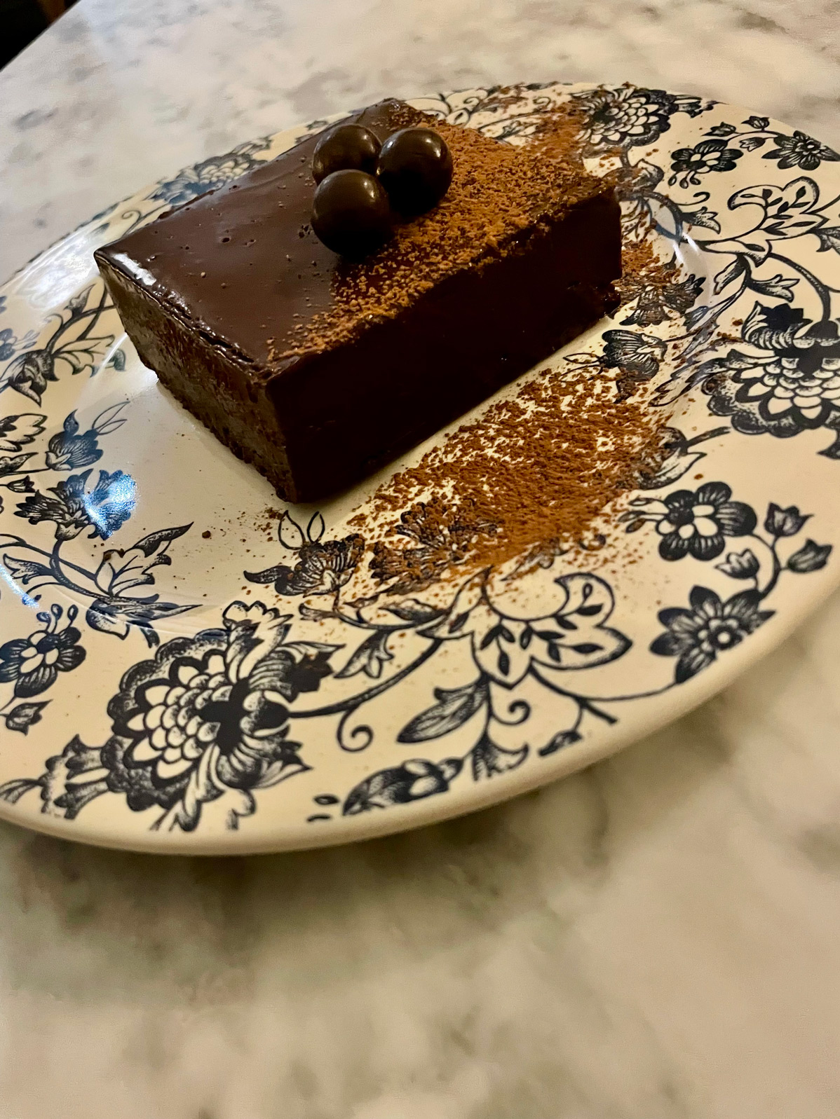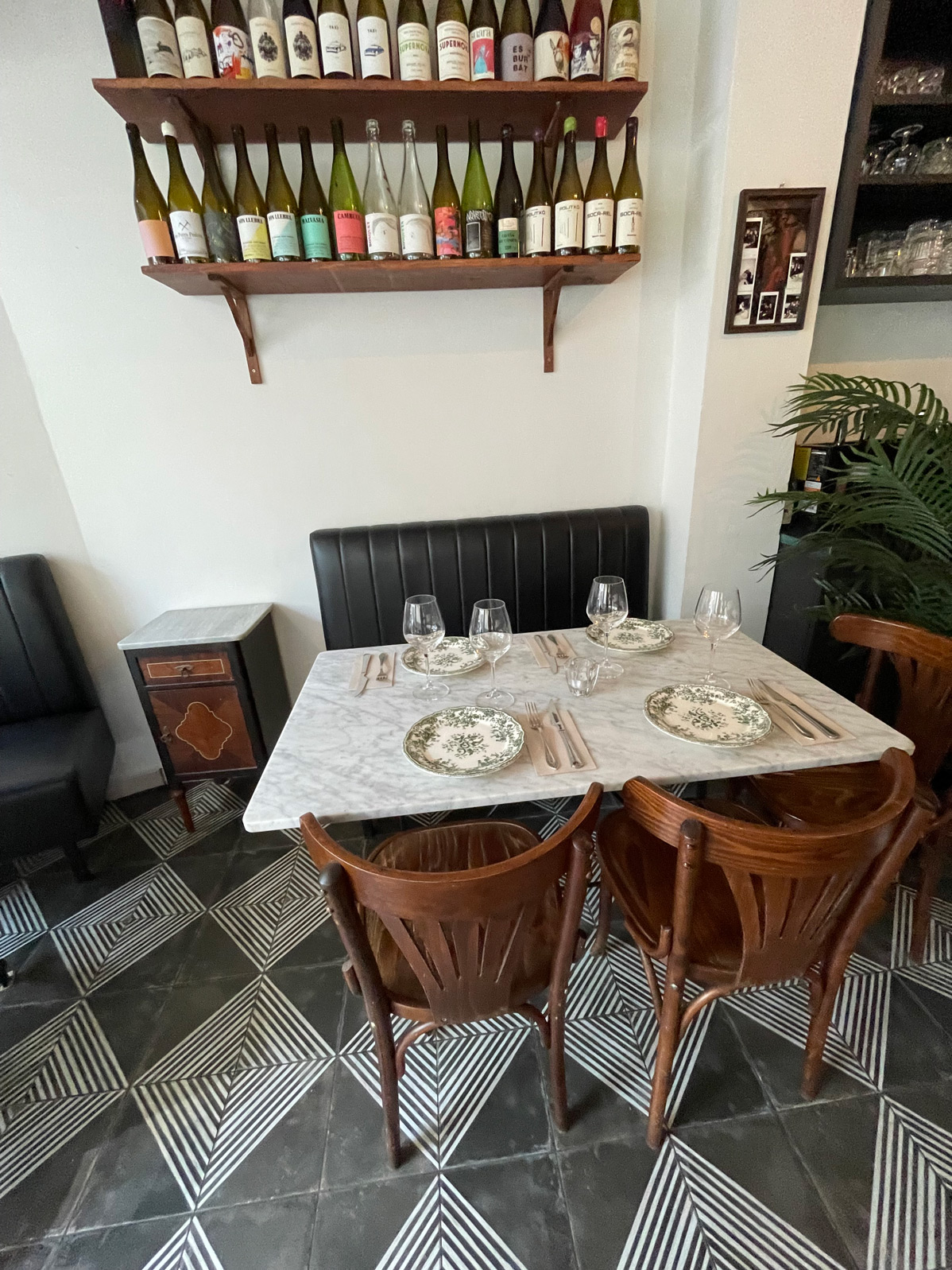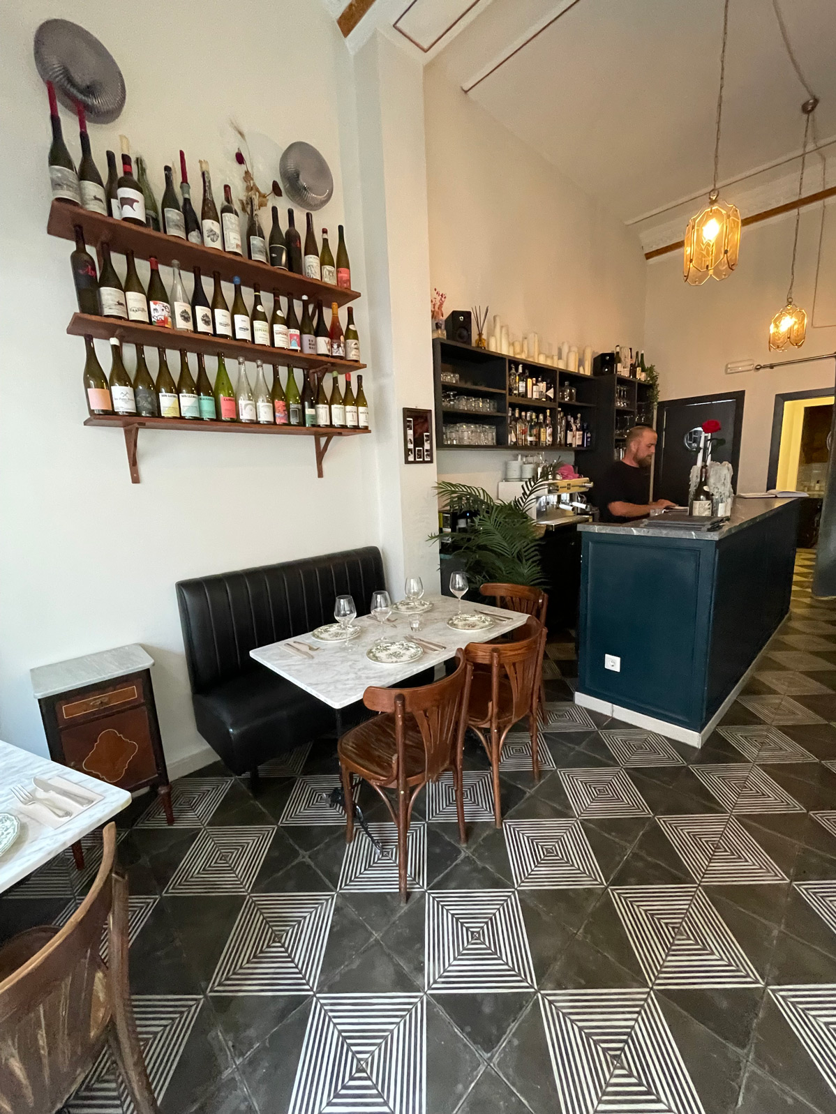 We’ve not yet eaten on the terrace, preferring the interior, with its contemporary black-and-white floor tiles, marble-top tables, and a mix of banquette seating and wooden, bistro-style chairs. The attractive plates, reminiscent of an English tableware design, are from Portugal. A small candle on each table creates a romantic air.