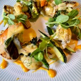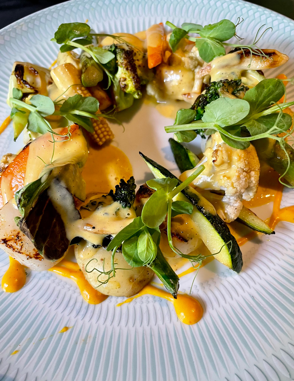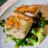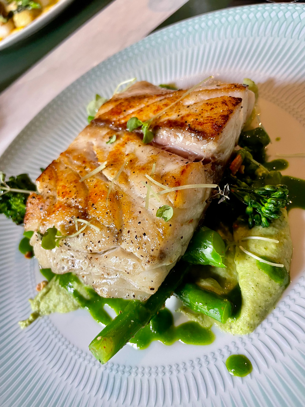 My companion chose and devoured his prettily presented grilled scallops with seasonal vegetables and an aji amarillo sauce (30€). I chose the grilled market white fish (corvina) with extra virgin olive oil, cashew purée, bimi, and a watercress emulsion (34€). The fish was perfectly cooked and complemented by the accompaniments.