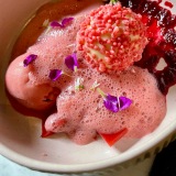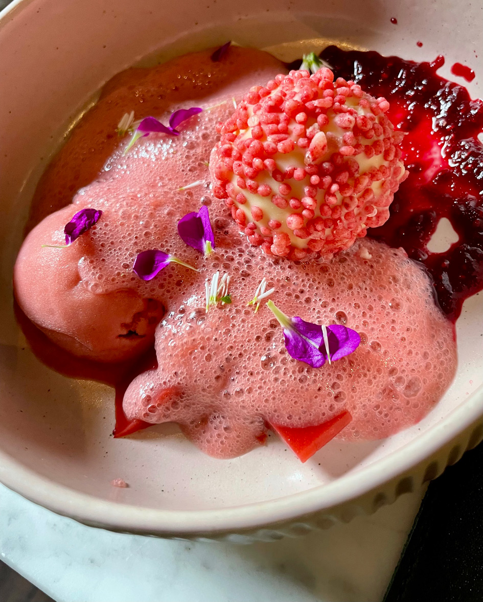 We shared a dessert: a strawberry and yogurt bonbon with wild-strawberry sorbet strawberry gelée, and chia and beetroot coulis (14€), which countered the sweetness of the rest of the dish.