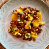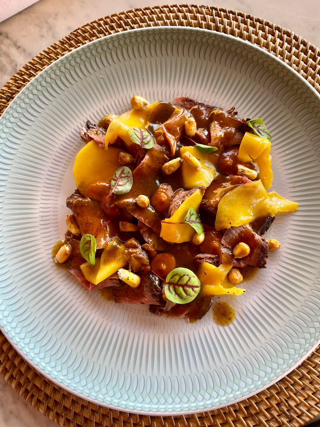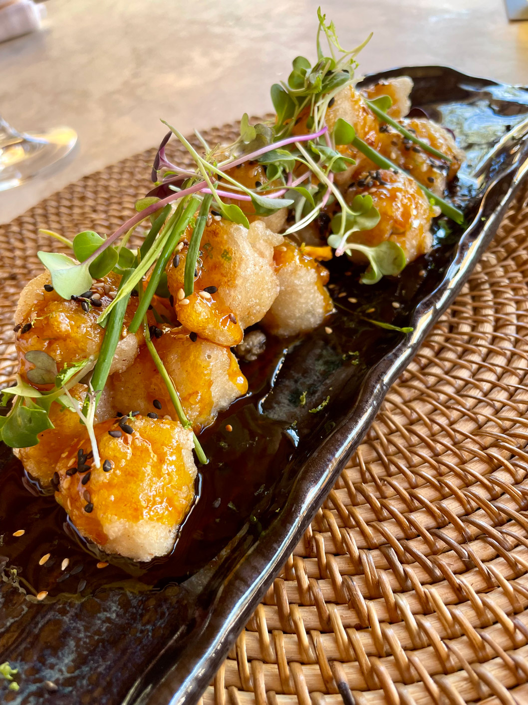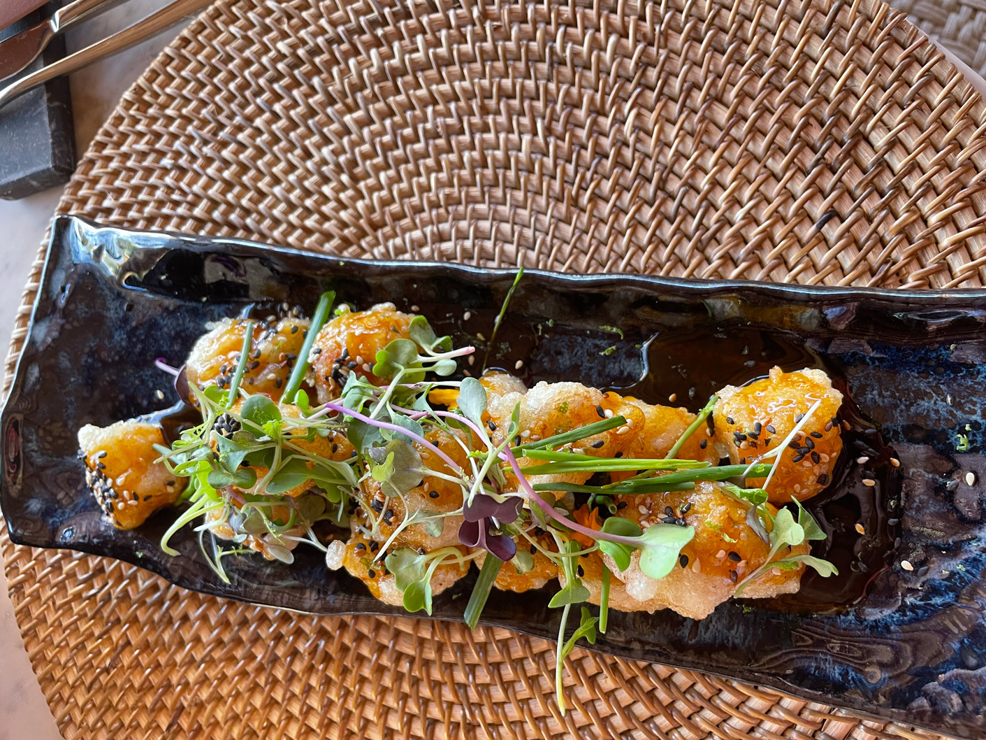 We ate à la carte, starting with shrimp fritters with orange dressing, rocoto (a chilli pepper native to Peru), and lime (25 €) and Iberian pork sashimi with sweet and sour mango sauce and sesame (27 €). Two people could share either of these dishes as a satisfying starter.