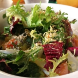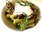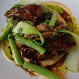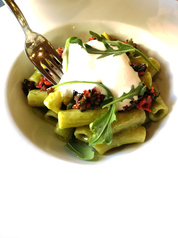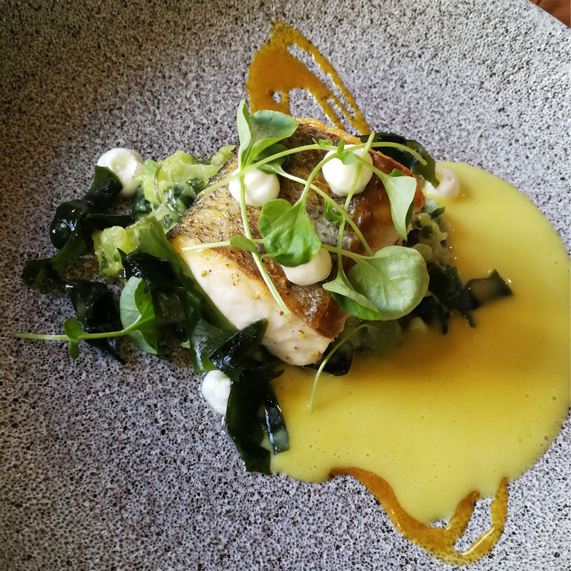 The D’Menú lunch menu costs 18 € (including bread and water). We had a choice of two starters: salad of marinated salmon with avocado and passion fruit oil or rigatoni with pesto with smoked cheese mousse. I had the salad (my partner the pasta); the well-dressed mixed leaves were fresh tasting and looked appetizing. A tasty dish.