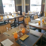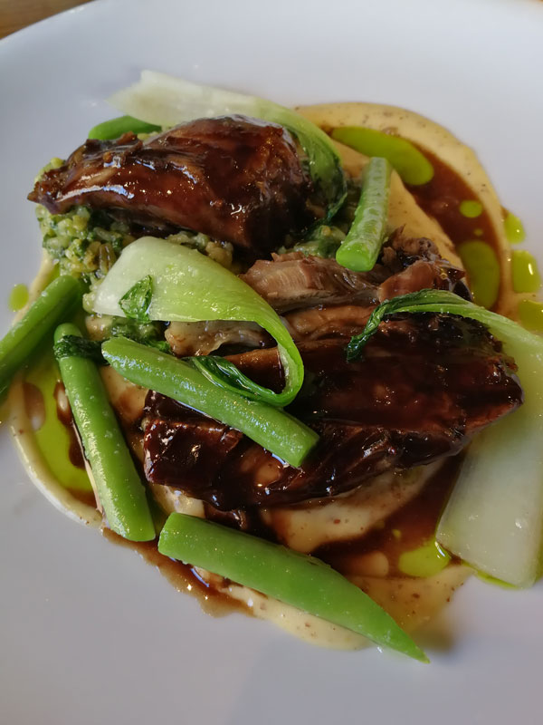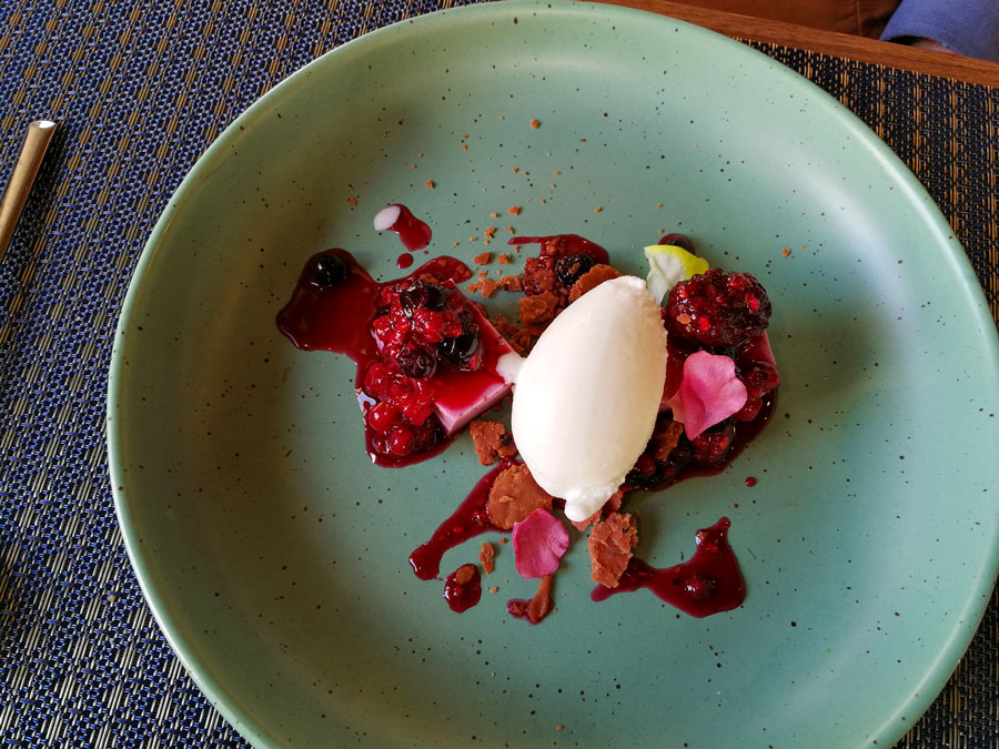 My main course was a flavourful dish of tender pork knuckle, served on buckwheat with fresh herbs, vegetables, and a zingy mustard and honey sauce. At this point I felt we’d already had good value for money, but dessert was still to come. We tried both choices between us: red fruits with maple syrup and yogurt ice cream, and chocolate ganache with orange slush and hazelnut mousse. Both were divine.
