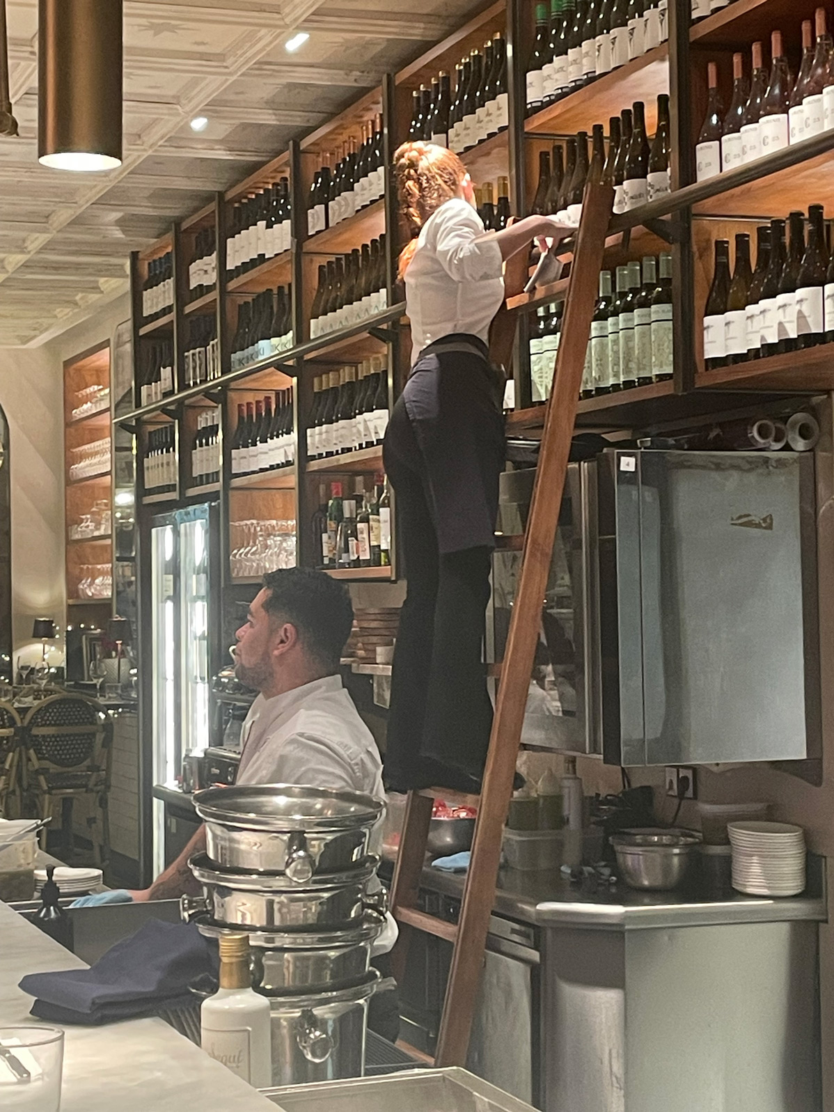 Most of the seating in this narrow restaurant is at the long bar, but there’s a private table for up to eight people at the rear and four tall tables for groups of four or five. If you like to watch chefs at work, sit at the counter and enjoy the culinary theatre par excellence.