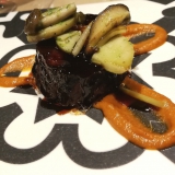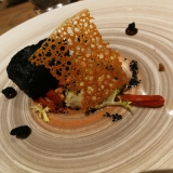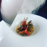 We tried the April menu, which included a technical dish named quail croissant – which was not what you’d expect, creamy rice with seafood, a flavourful turbot dish, and a delicious lamb kafta that arrived at the table on a mini grill over smouldering embers. Two desserts were included: a strawberry carpaccio with some surprising elements, and a fun chocolate ‘bomb’ in a wooden box, which became a spectacle.