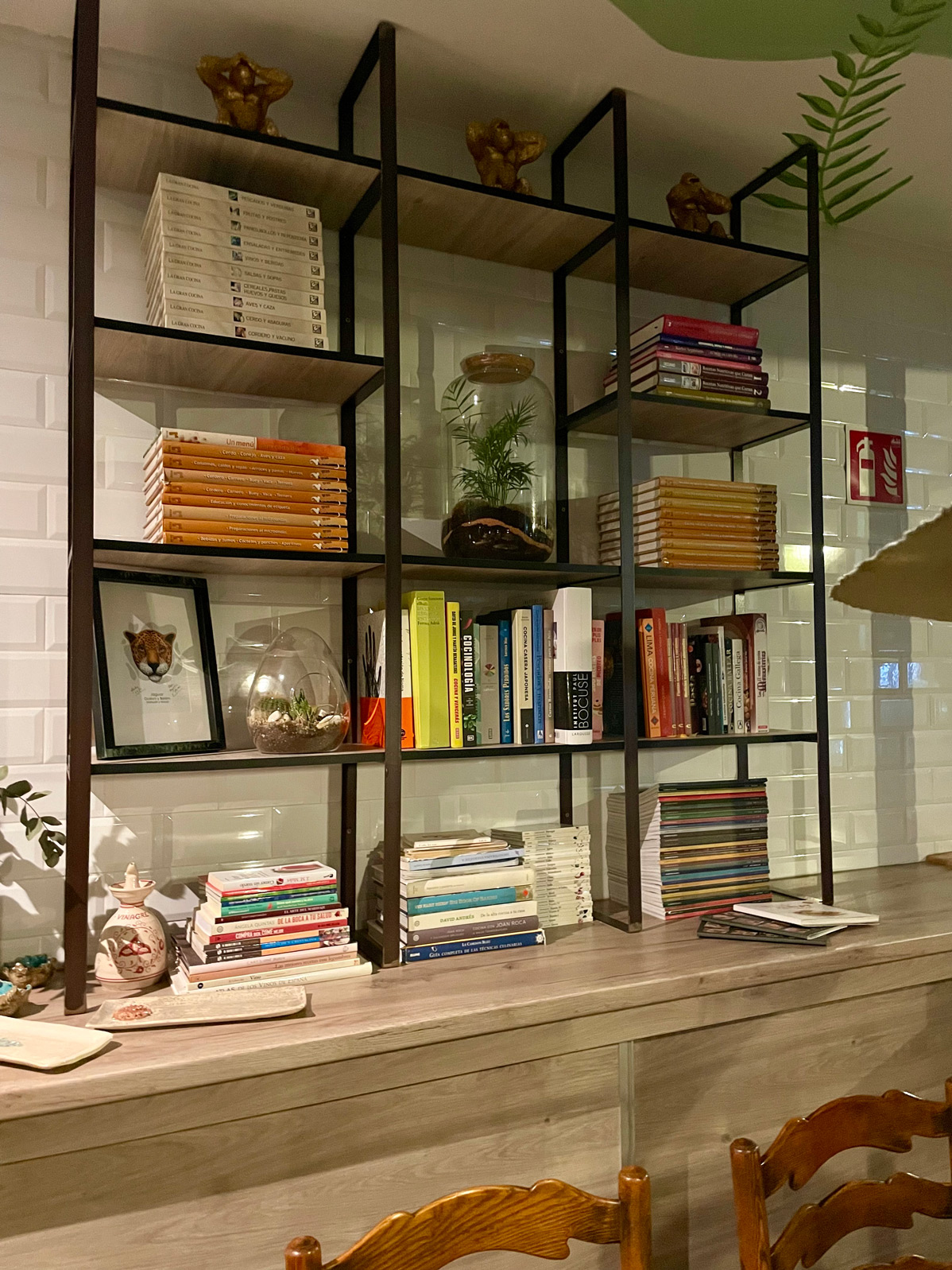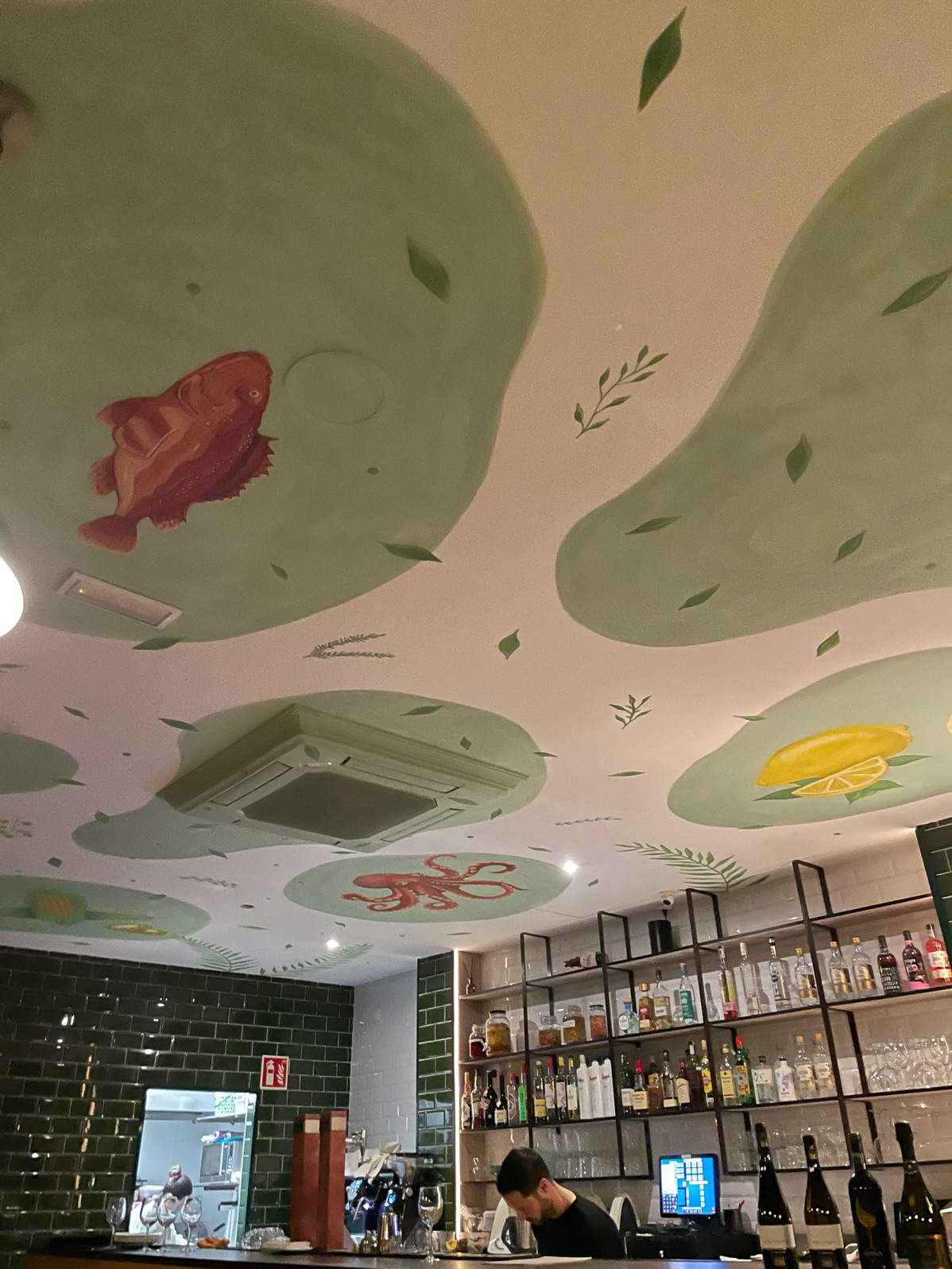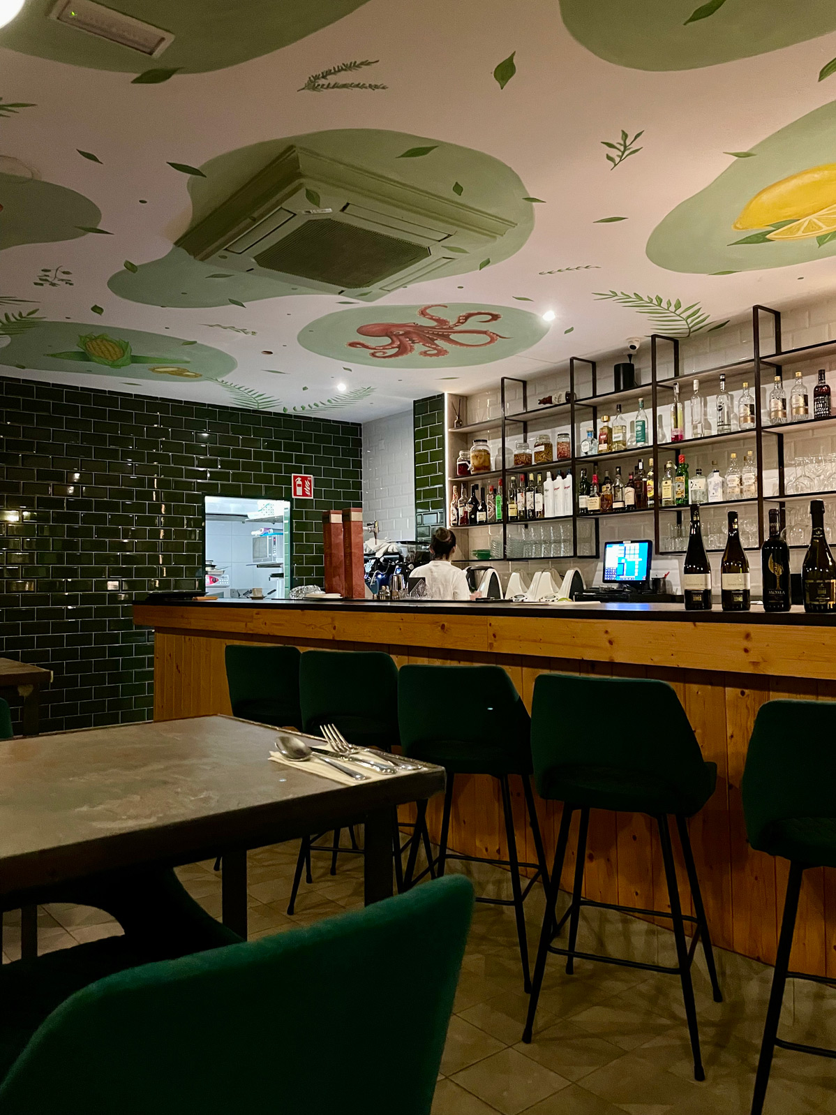 Gastrobar by Angélica Pastrana has a large front terrace, but I recommend a table indoors for the ambience and décor. Our gaze was immediately drawn up to the unique, hand-painted ceiling, with its depictions of Latin America and the Mediterranean. We were the first diners to arrive that evening, making it easier to take photos of the interior. This small space is a showcase of creativity, design, and painting skills.