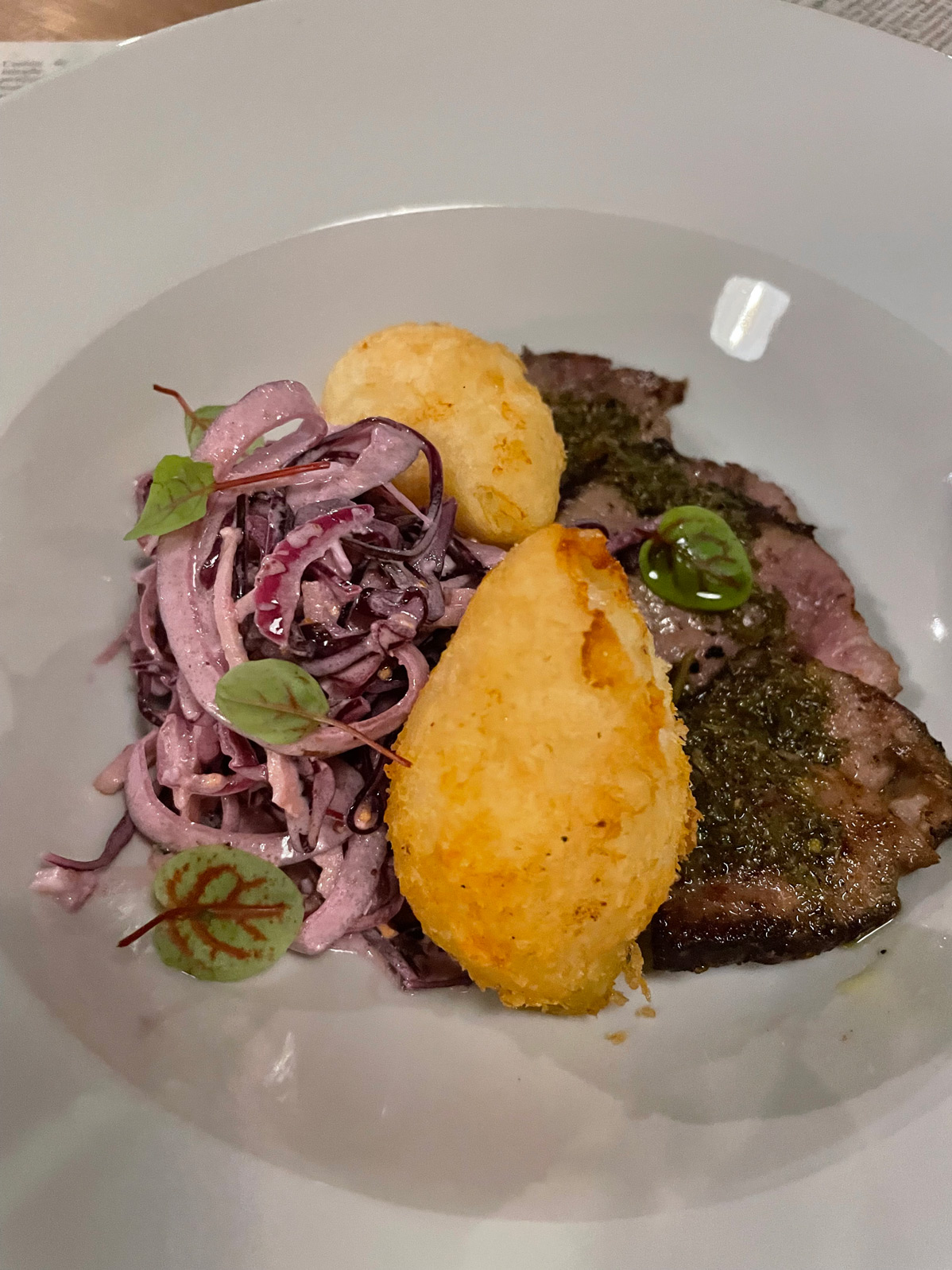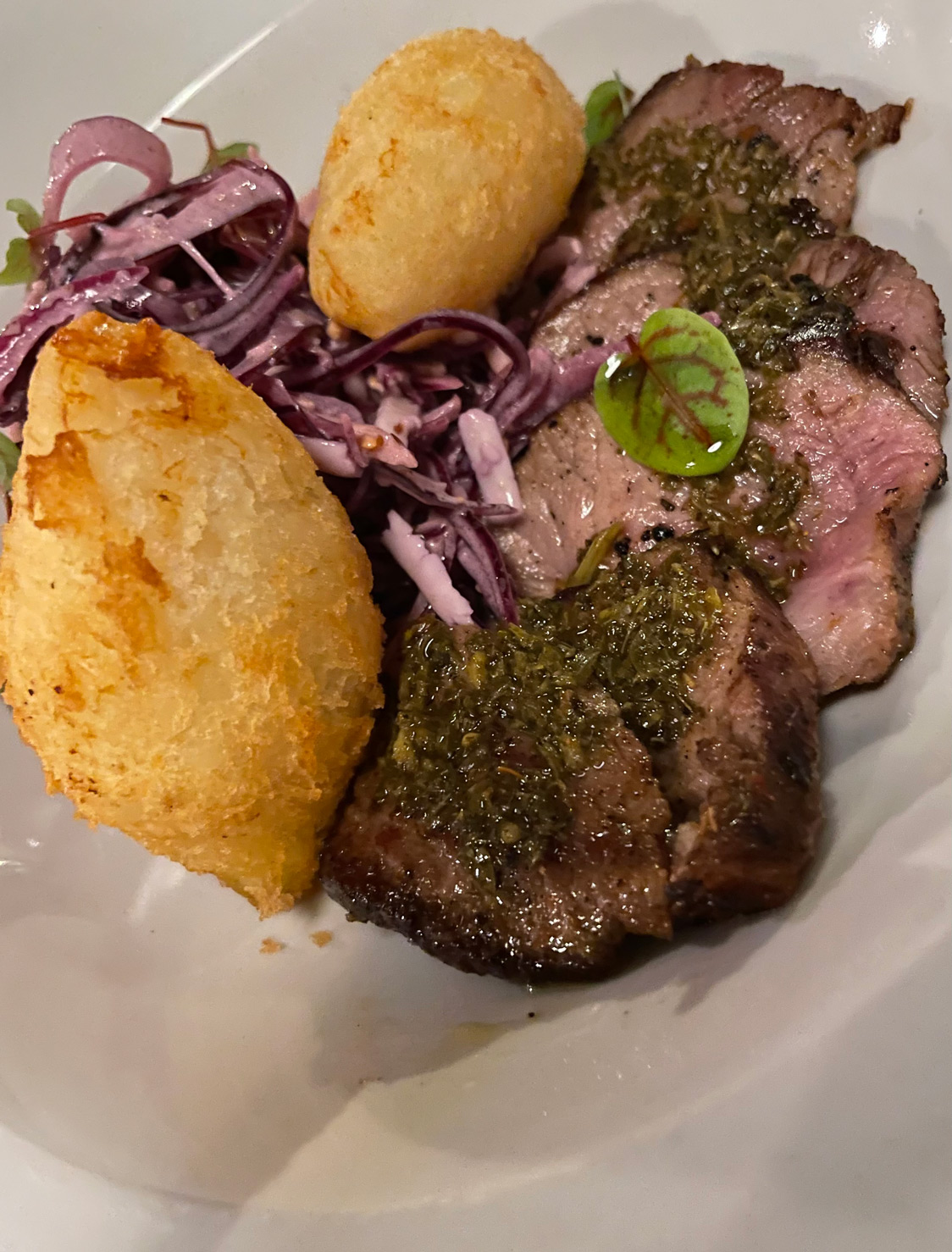 Our final savoury dish was ‘Presa Ibérica’ cooked sous vide at 65 degrees, finished under the grill, and served with home-made chimichurri (24€). It arrived with coleslaw and ‘carimañolas’, which are yummy, fried balls of Caribbean Colombian yuca filled with cheese. This is another dish showing Angélica’s attention to detail and care, and the high-quality ingredients she uses in her kitchen.