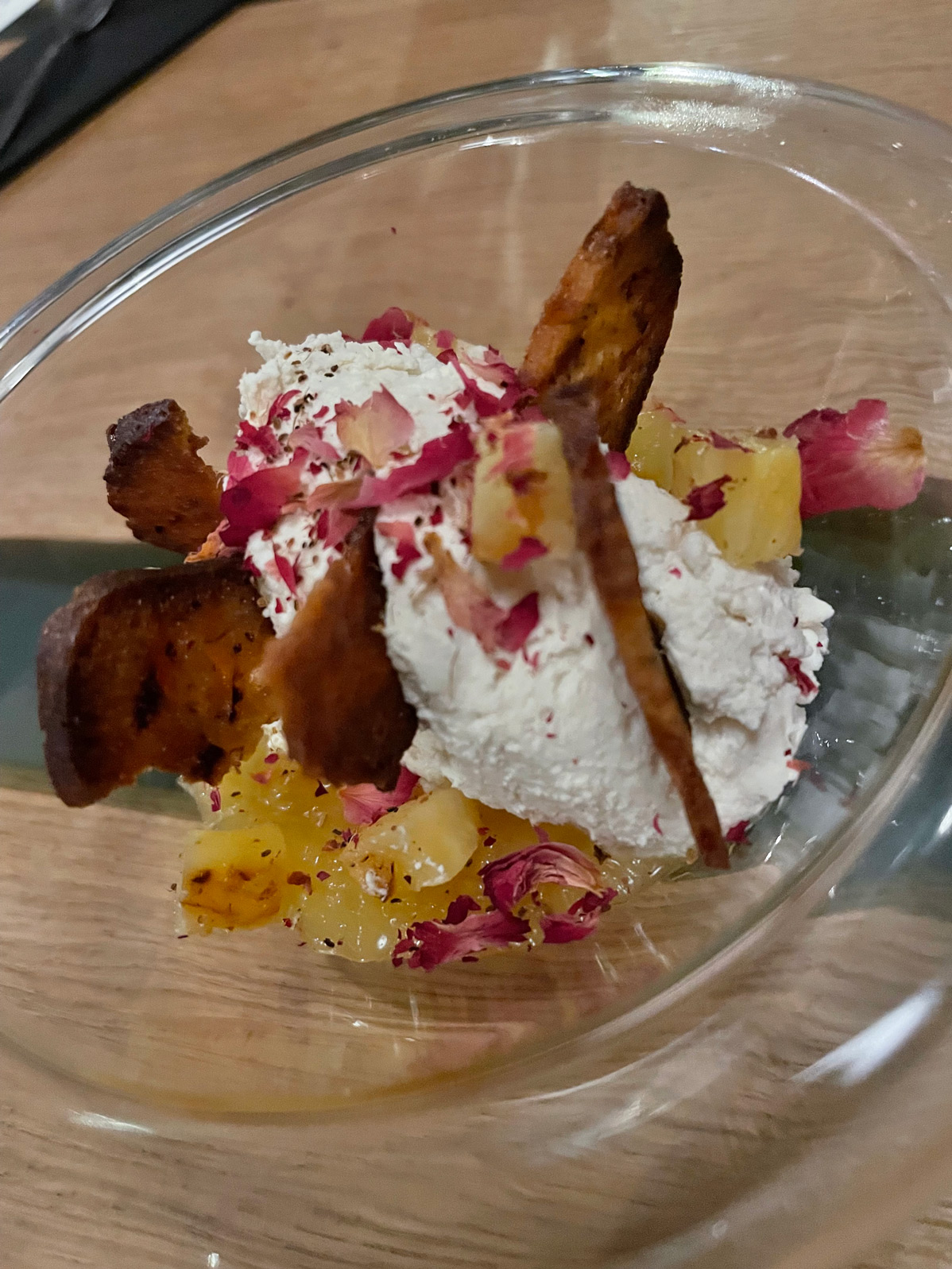 Our home-made dessert had a base of pineapple in rum and cinnamon, a light coconut mousse, roasted pineapple, and a garnish of crisped, thin slices of banana cake. Very moreish!