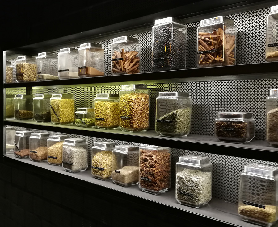 Working two people to each still, we set about creating our own gin. The shelves on one wall of this area were loaded with containers of flavouring ingredients from which to choose. A printed sheet provided some helpful guidance about flavours and the quantities needed of any chosen ingredient (surprisingly small). But it was down to us – with the benefit of Kate’s chat about the flavours (and the gin essentials) – to create our own blend.