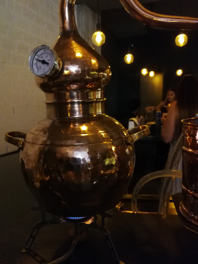 Kate then led us to a corner housing a traditional copper still (and boxes of new bottles waiting to be filled), where she explained the process of distilling. After one of three gin cocktails served during the three hours, it was time for some real hands-on fun. We climbed a few steps to a lab-like area at the back of the premises, where bench-style tables were set up with a number of small copper stills. I had a flashback to my fear of Bunsen burners in my school science lab but Steve and Ross, owners of the Mallorca Gin Distillery, took care of lighting the burners under the stills.