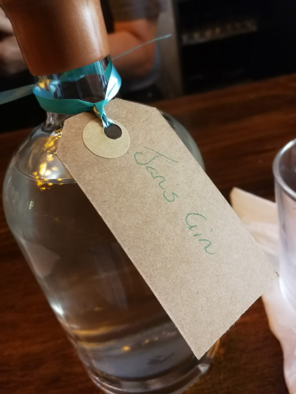 Once the gin was ready and poured into bottles, Kate gave us all card labels with string, on which to create a name for our own gin. The Boss and I had shared a still, so produced the same gin, but we gave our own bottles separate names. Mine was Jan’s Gin – not very creative (that’s what a few gin-based drinks does for me), but The Boss was inspired to name his IN.DI.GIN.(H)OUS. We each sealed our bottle tops by dipping them into hot wax, and it was then time for our final cocktail (Army & Navy), before we left, clutching our unique gin creations.