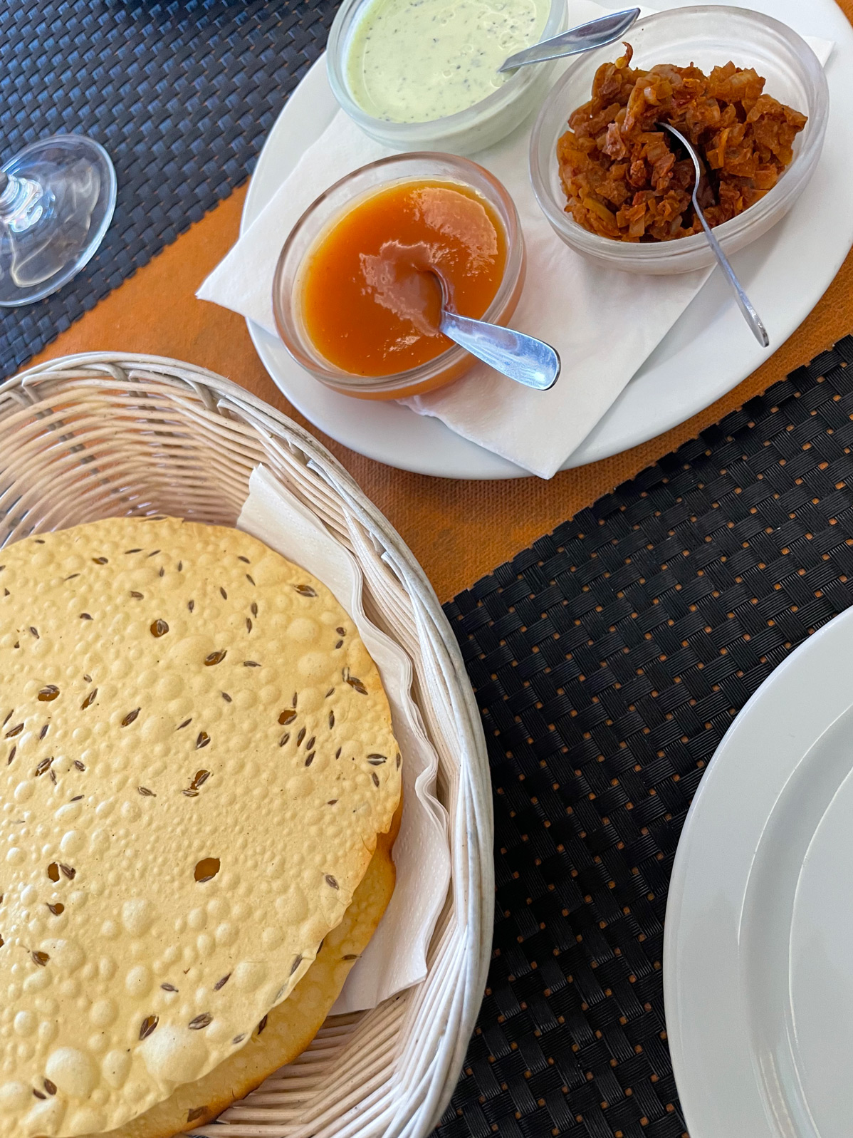 We had a late lunch and were surprised to see we weren’t the only people eating that day. Indian Taj has a covered terrace at the front and an open terrace on the other side of the promenade, but nobody was eating outside that day. We sat indoors on comfortable chairs.