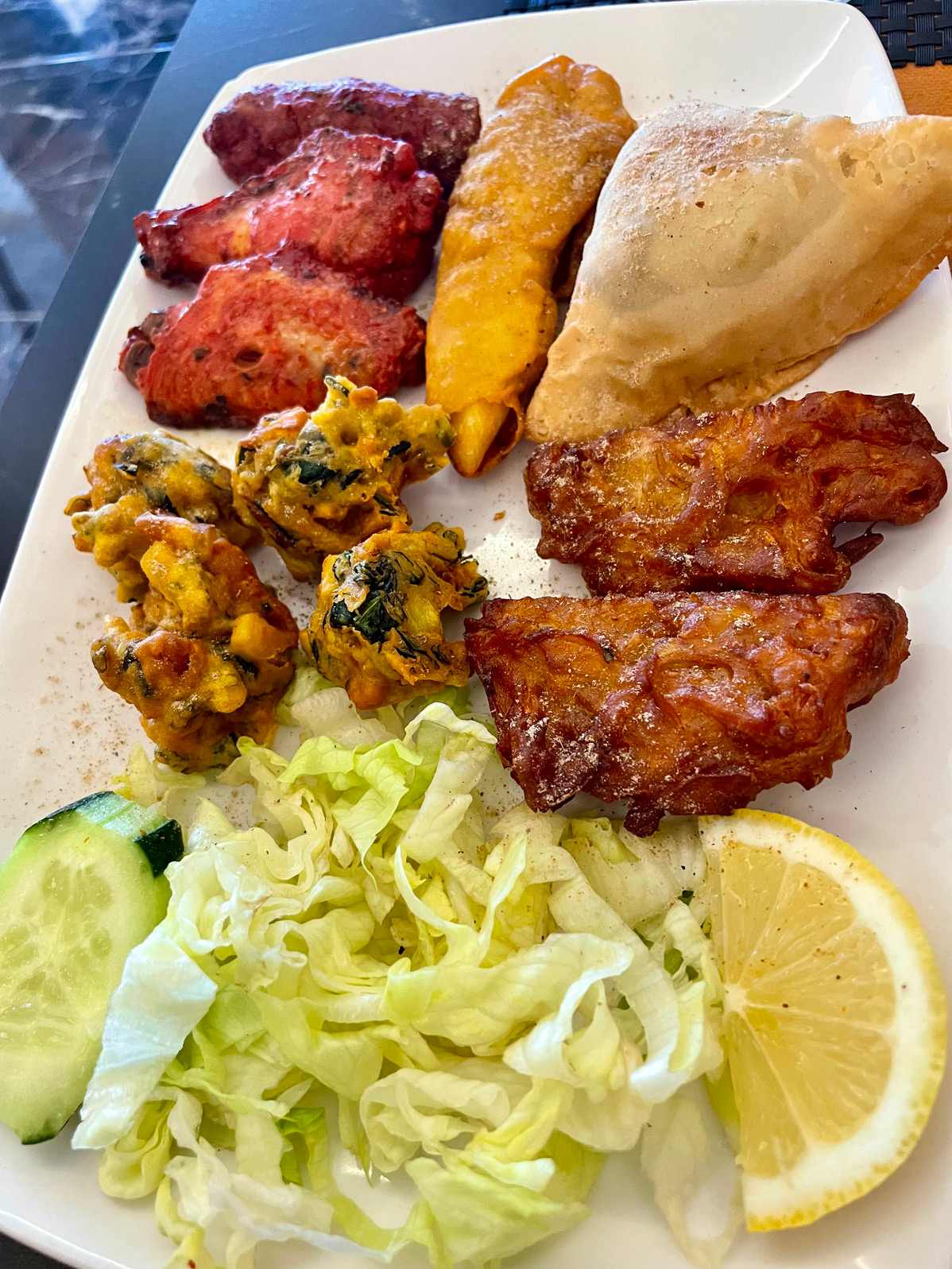 We began by sharing a basket of jeera poppadum, flavoured well with cumin seeds and served with three dips (2,25€). For our starter, we shared the Indian Taj ‘Especial’ –(14,95€), a platter of onion bhajis, vegetable pakora, vegetable samosa, chicken wings, chicken pakora, and sheesh kebab (14,95€). This was a good introduction to our lunch.