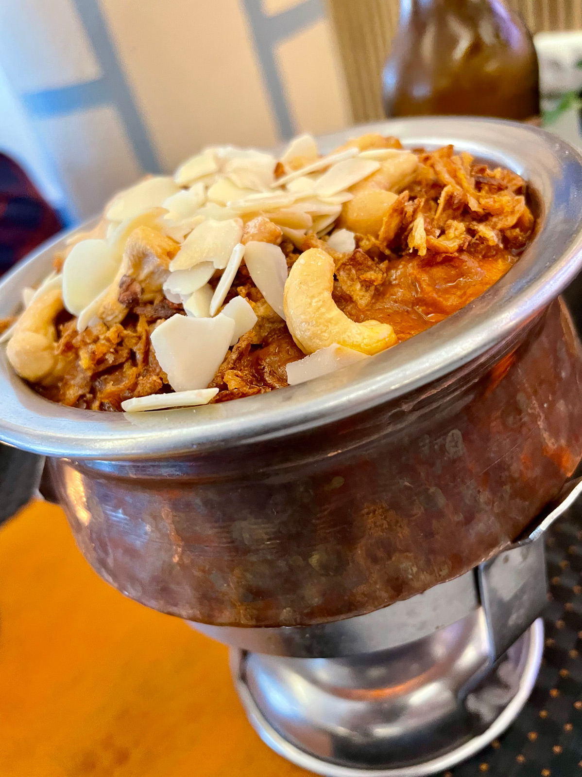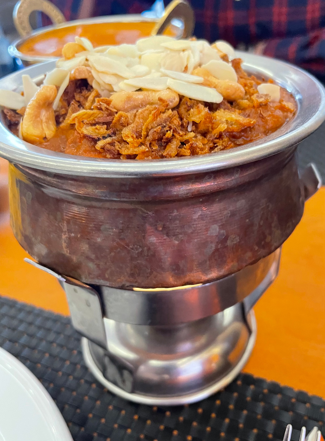 Our food came in attractive, individual, Indian serving dishes mounted over a tea light to keep them warm at the table, and we were given heated plates – an unexpected and appreciated touch.