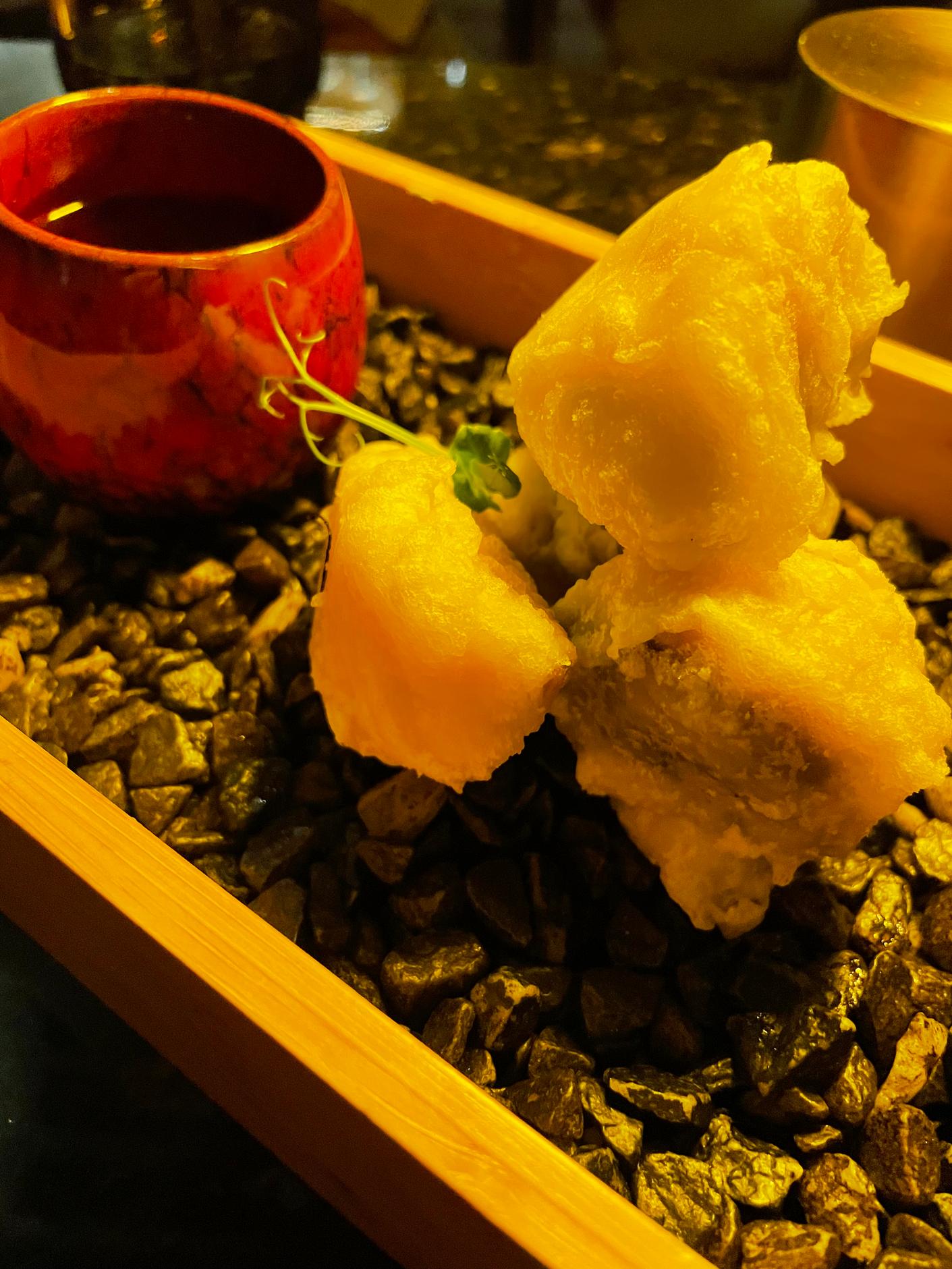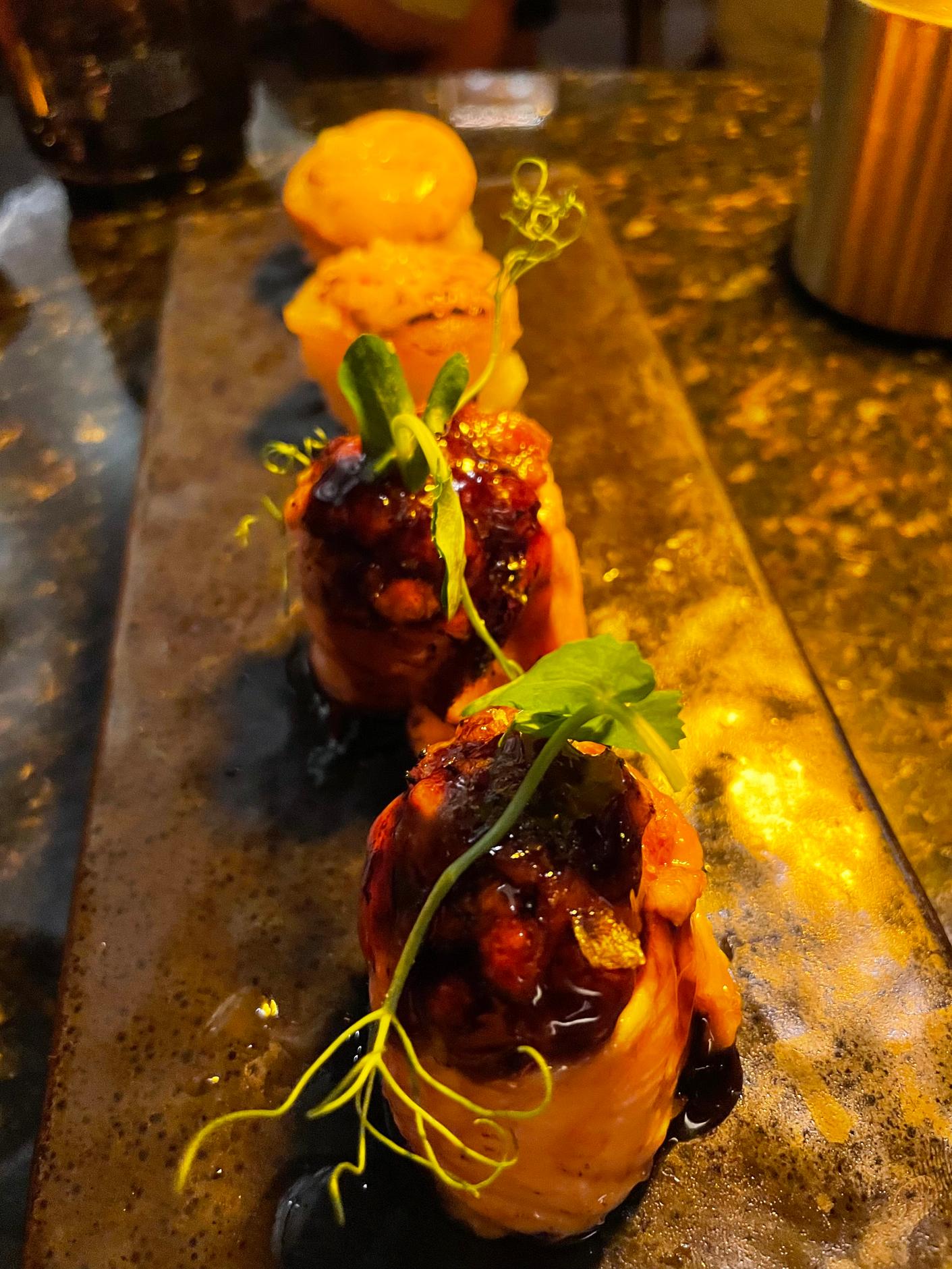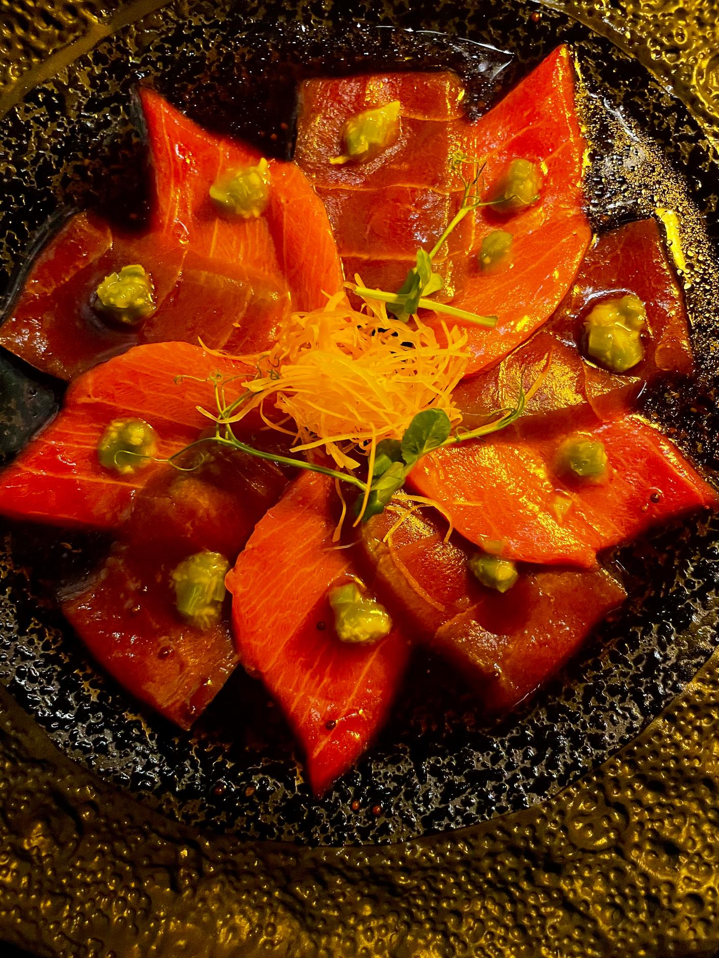 Our tasting menu included ‘usuzukuri’, extra-thin tuna belly from Cadiz with truffle sauce, kizami wasabi, sprouts, and vegetables. One of my favourite dishes was the hotate miso: seared scallops flambéed with white miso carbonara and crispy air-dried beef. But I loved each dish for its flavours, presentation, and the evident high-quality of the ingredients and home-made sauces.