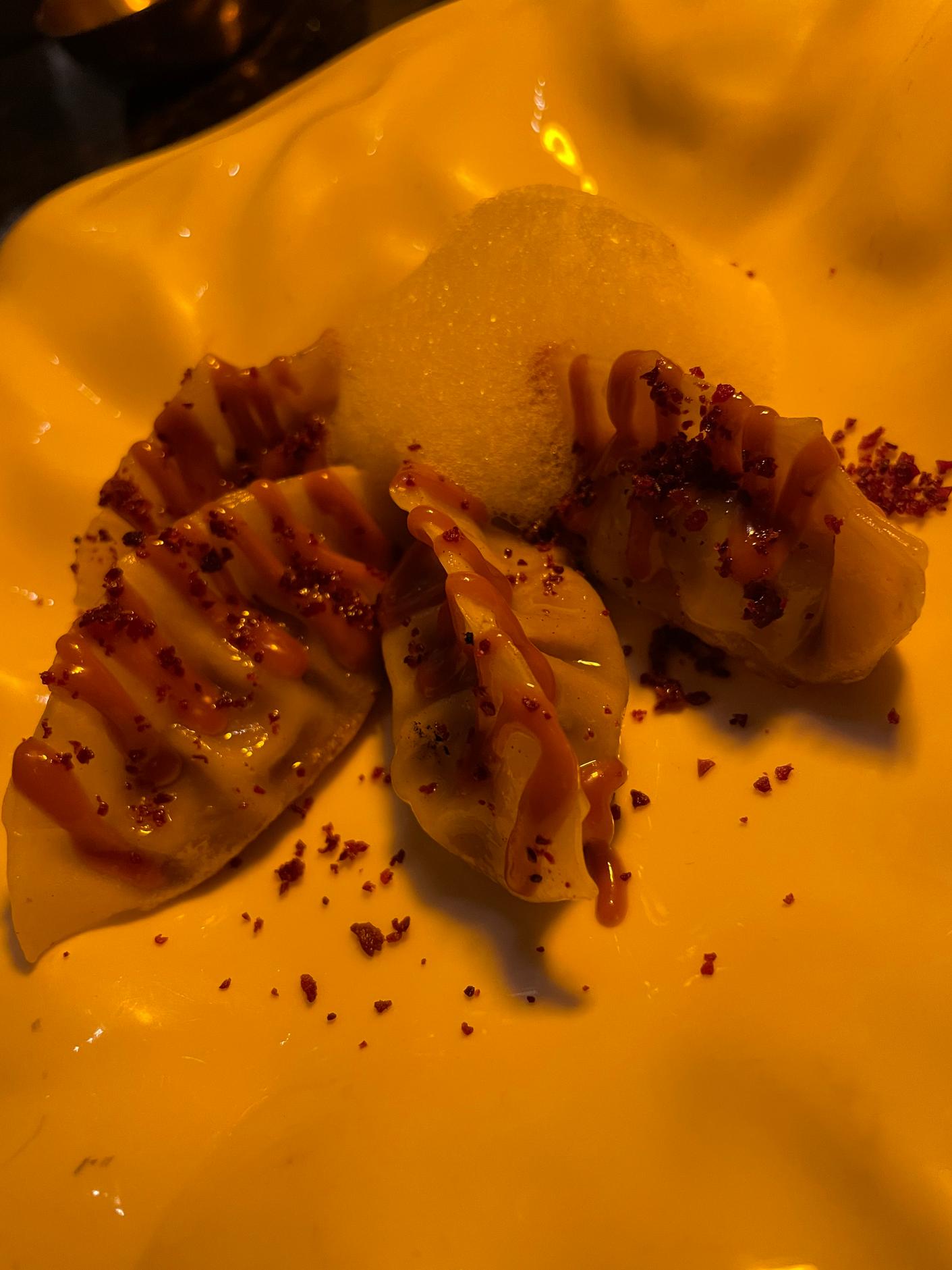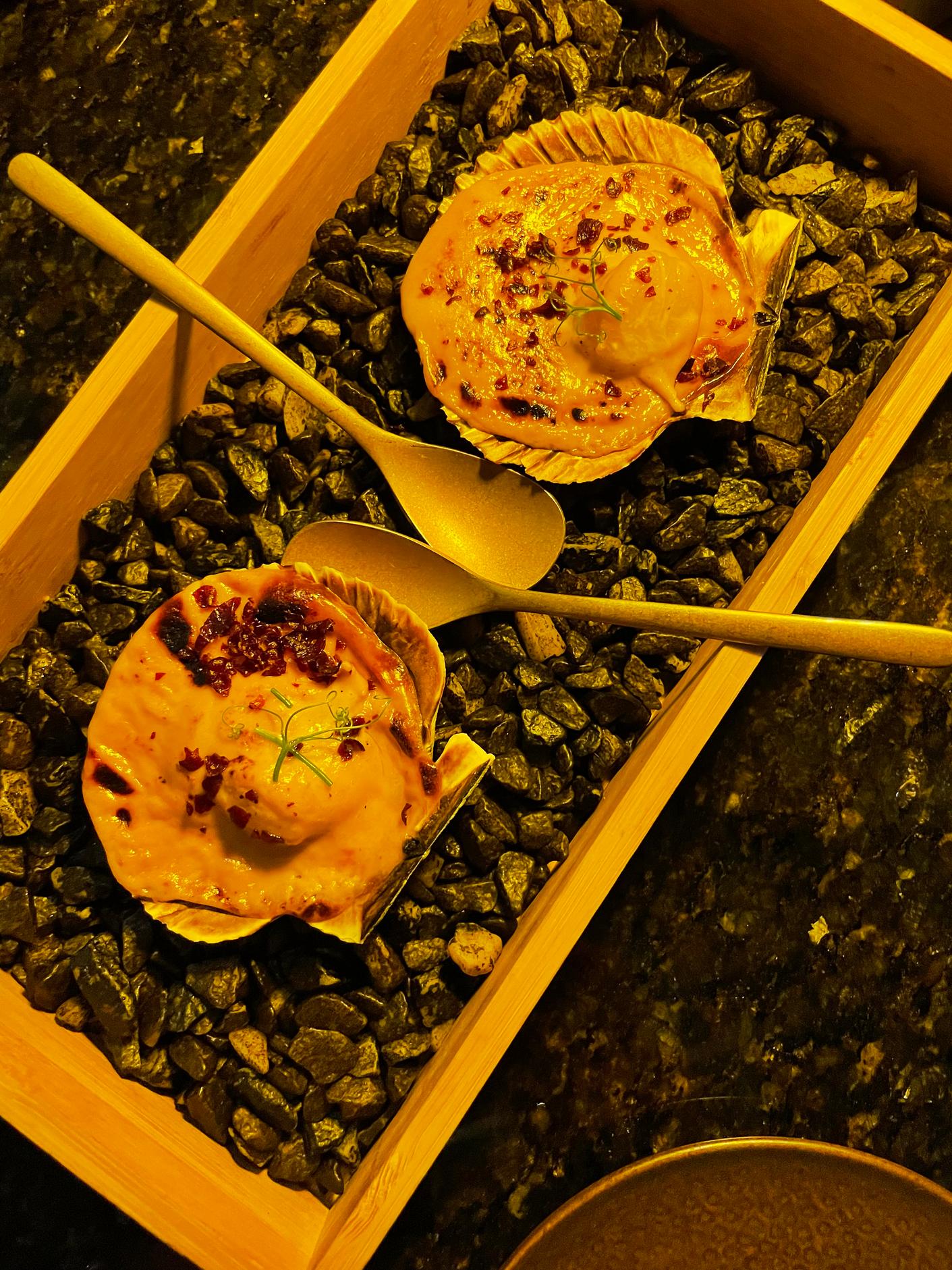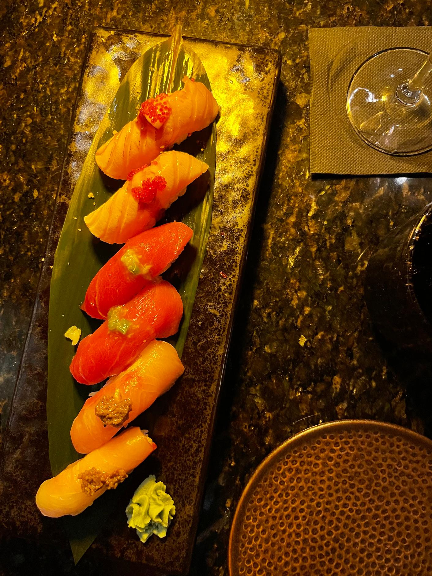 Our tasting menu included ‘usuzukuri’, extra-thin tuna belly from Cadiz with truffle sauce, kizami wasabi, sprouts, and vegetables. One of my favourite dishes was the hotate miso: seared scallops flambéed with white miso carbonara and crispy air-dried beef. But I loved each dish for its flavours, presentation, and the evident high-quality of the ingredients and home-made sauces.