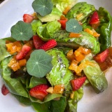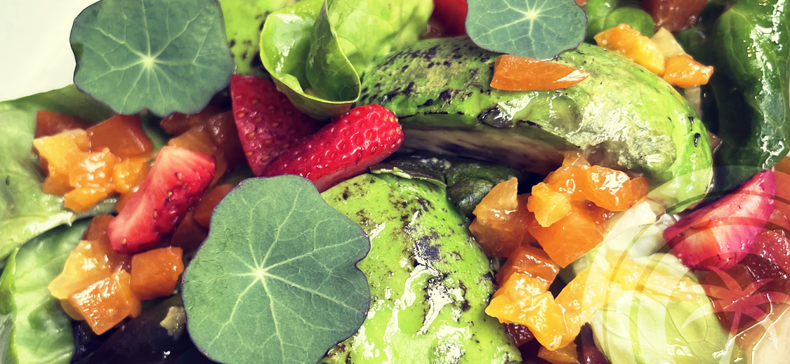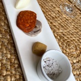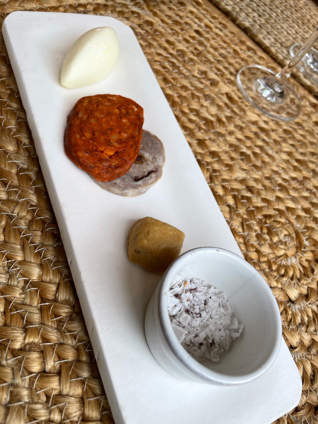 Different menus are offered for lunch and dinner. At lunchtime, the menu is à la carte. We chose to share the starter of grilled avocado with salad, an apricot vinaigrette, and strawberries from Sa Pobla (16€). Before this arrived, our server brought us a warm, split llonguet roll, with smoked butter and a slice of sobrasada and botifarró as a complimentary appetizer.
